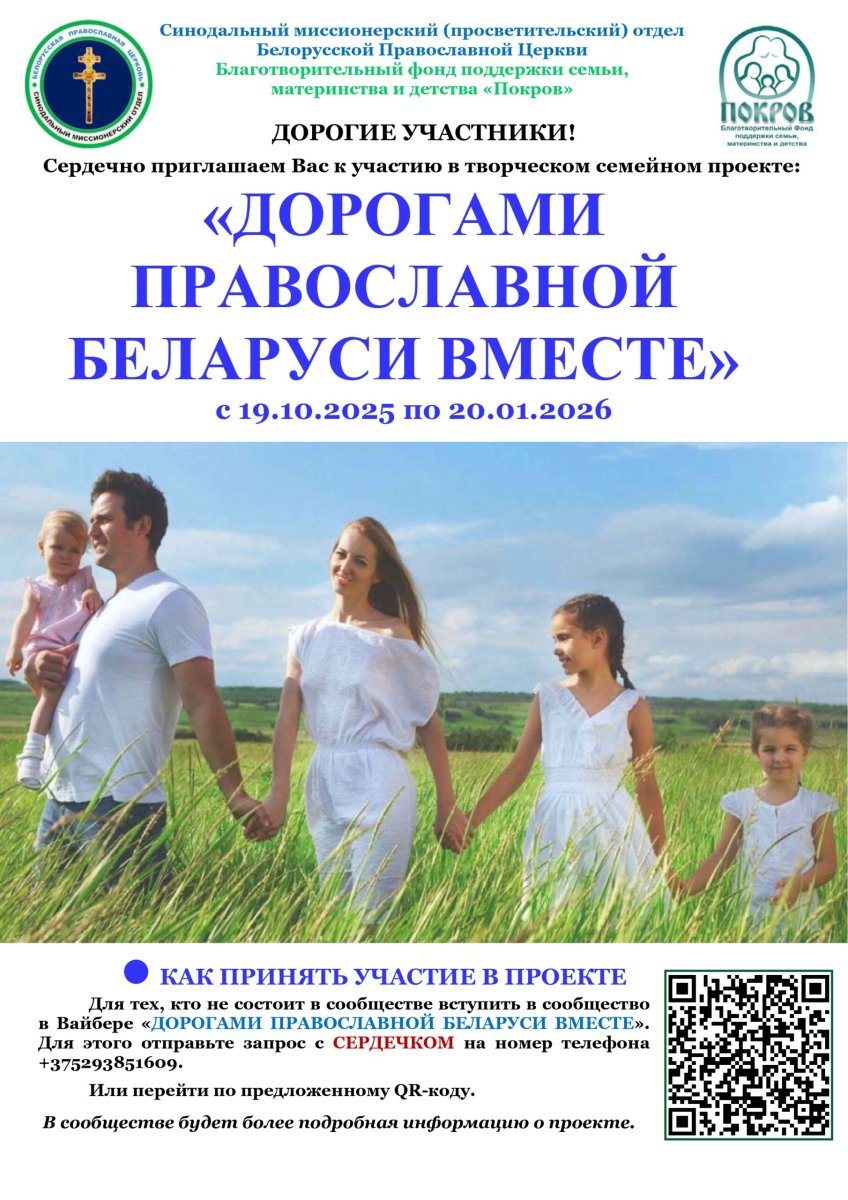| 30 ОКТЯБРЯ 2025 (Четверг) 13:39:50 Пройдем дорогами православной Беларуси вместе: с 29 октября по 6 ноября проходит второй этап одноименного семейного творческого проекта!Проект стартовал 19 октября и продлится до 20 января. Предусмотрены шесть этапов. Участие в проекте можно начать с любого этапа! Итогом каждого станет видеопрезентация лучших работ, которые можно будет посмотреть на YouTube канале "Сердцеград". Организаторы: Синодальный миссионерский отдел Белорусской Православной Церкви и Благотворительный фонд поддержки семьи, материнства и детства "Покров". Проект состоит из 6 этапов, продолжительность каждого от 9 до 12 дней. Для кого проект: для всех, кто интересуется православной духовностью, белорусской историей и культурой. Участники смогут больше узнать об истории, архитектурных памятниках, материальных и духовных богатствах монастырей, святых и святынях Беларуси. Как принять участие: вступить в сообщество в Вайбере, оправив запрос с на номер: +375 29 3851609. В сообществе будет подробная информация о проекте. 2-й творческий этап: с 29 октября по 6 ноября. Участники 2-го этапа создают творческий композиционный сюжет на православную тематику, взятый только по Витебской области. Необходимо: — внимательно прочитать условия — выполнить творческое задание — выслать фотографии в сообщество Итогом второго этапа станет презентация лучших работ! Если вы не участвовали в первом этапе — это не является препятствием! Присоединиться можно на любом этапе! Присоединяйтесь к творческому проекту, а также приглашайте принять в нем участие своих друзей и близких! 100 активных семей получат подарки по почте. Из них 40 самых активных семей будут приглашены на Рождественский концерт. Видеопрезентация лучших работ участников первого этапа проекта. / sobor.by/ (просмотров 726) |