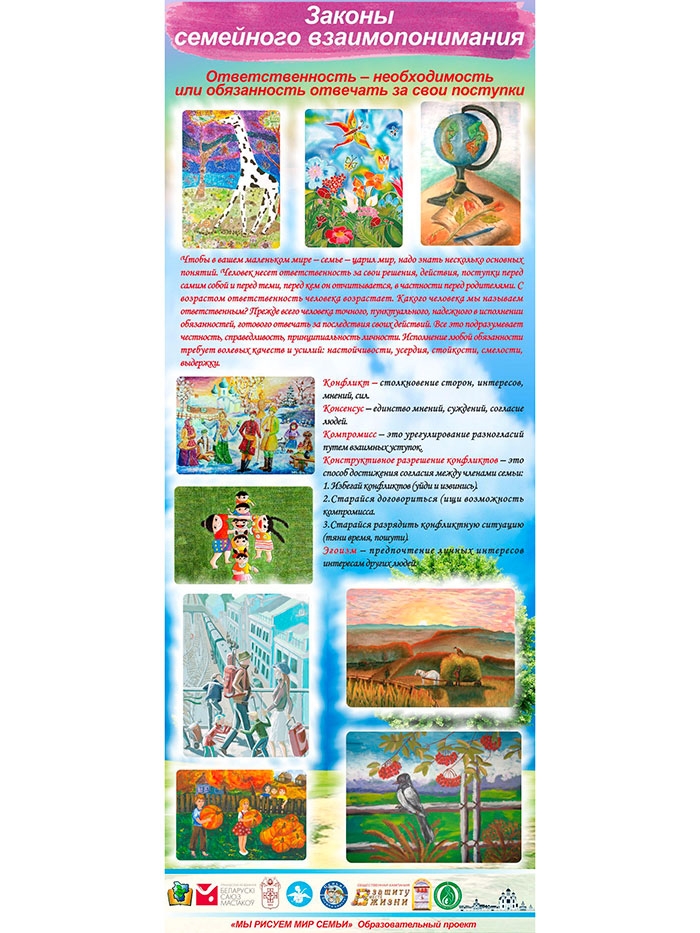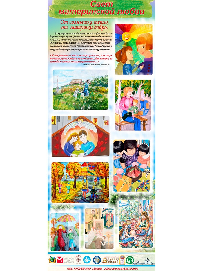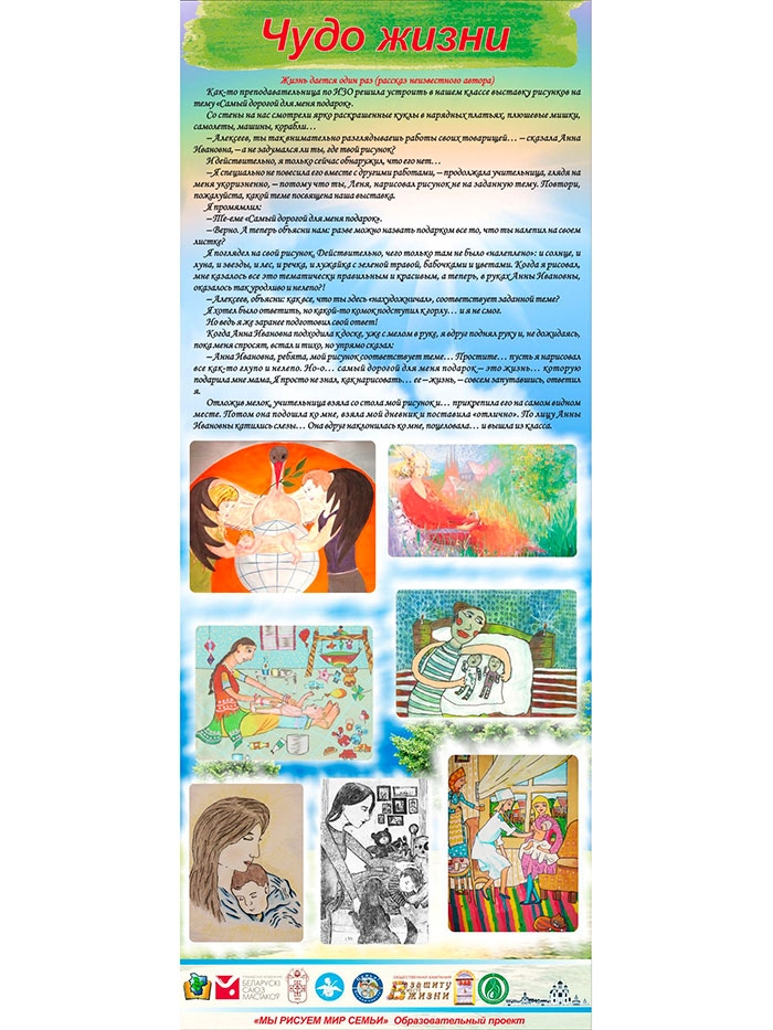 Как прокомментировали в Минском городском Институте развития образования, где состоялась первая презентация проекта, интерактивная выставка «Мы рисуем мир семьи» позволяет в доступной форме донести значение и важность семьи и семейных ценностей до детей младшего и среднего школьного возраста. Стоит отметить, что в минских школах уже проходит выставка Центра защиты материнства и семейных ценностей БПЦ «Человеческий потенциал Беларуси», разработанная для старшеклассников и студентов.