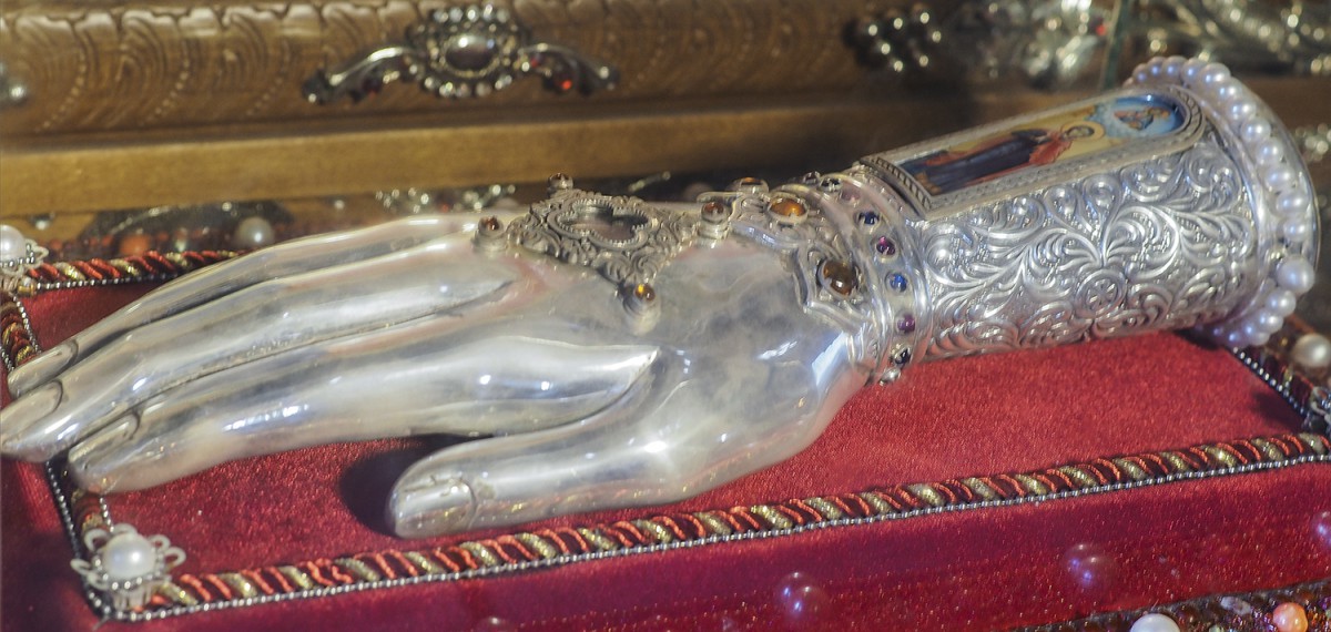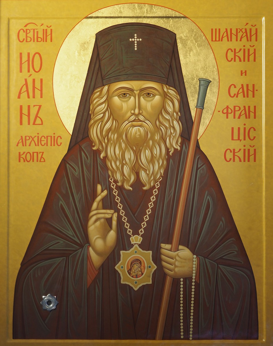 Икона святителя Иоанна Шанхайского и Сан-Францисского с частицей мощей. Частицу мощей святителя Иоанна минскому приходу принес в дар кафедральный собор иконы Божией Матери «Всех скорбящих Радость» в Сан-Франциско в благодарность за написание иконописцем прихода Ольгой Черняк нескольких икон для храма. |