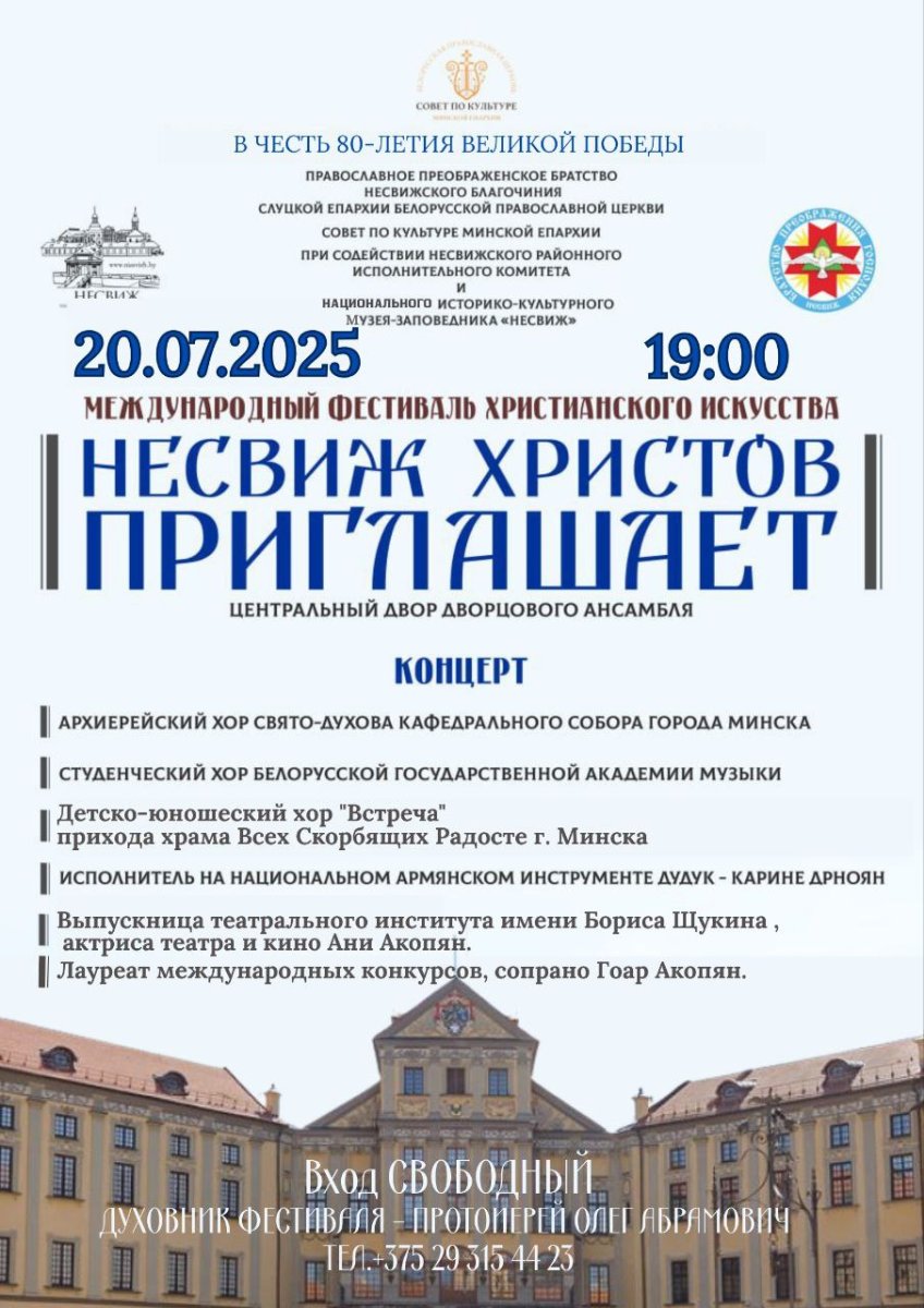 | | 19 ИЮЛЯ 2025 (Суббота) 10:55:58 20 июля в Несвижском замке состоится концерт Международного фестиваля христианского искусства "Несвиж Христов приглашает", приуроченный к 80-летию Великой Победы.