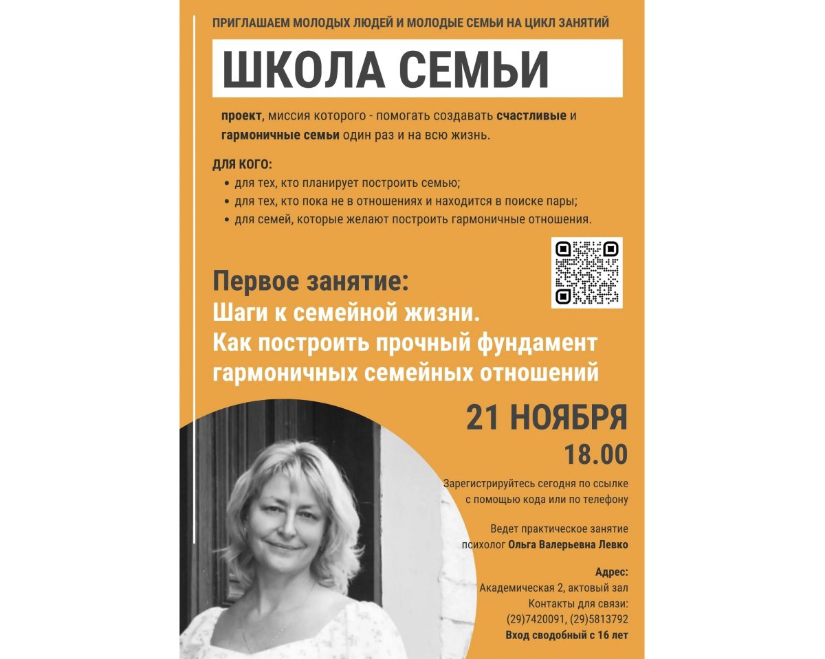 Первое занятие состоится 21 ноября "Шаги к семейной жизни. Как построить прочный фундамент гармоничных семейныхотношений". Начало в 18.00.