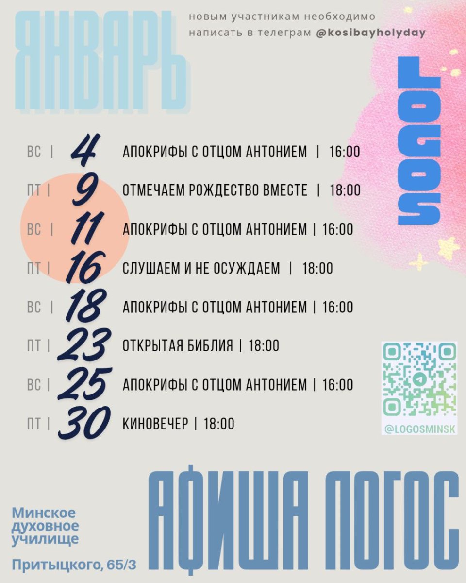 23 января в приходе иконы Божией Матери "Всех скорбящих Радость" города Минска состоится очередная встреча молодежно-просветительского объединения "Логос". Тема мероприятия - "Открытая Библия".
