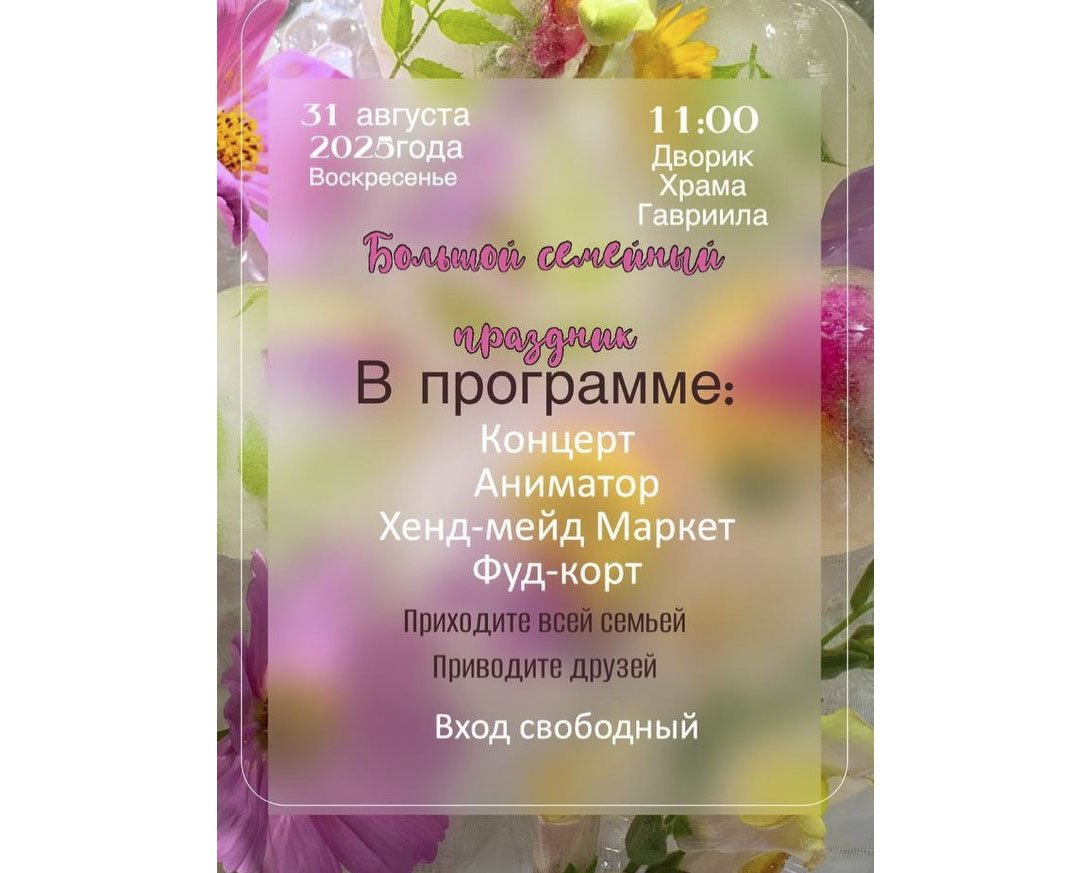 | | 27 АВГУСТА 2025 (Среда) 11:29:54 "Приглашаем провести последний день лета вместе!": 31 августа в приходе святителя Спиридона Тримифунтского города Минска состоится «Большой семейный праздник».