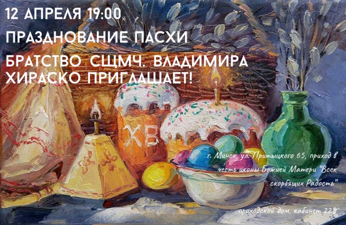12 апреля братство священника Владимира Хираско прихода иконы Божией Матери "Всех скорбящих Радость" города Минска отпразднует Светлое Христово Воскресение. Начало в 19.00.