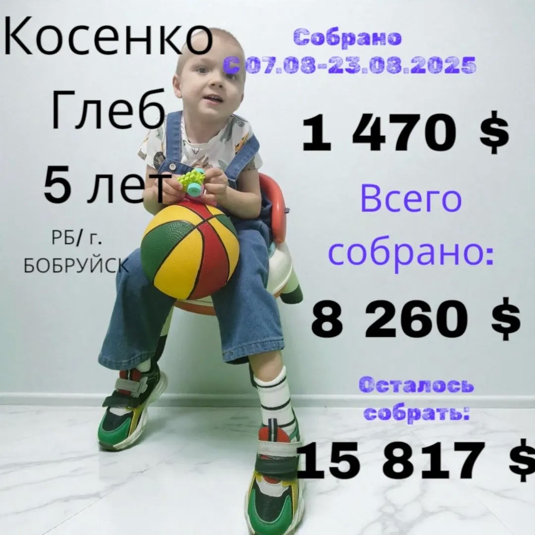 | 24 АВГУСТА 2025 (Воскресение) 16:07:39 Мечты сбываются, когда есть поддержка! Говоря о маленьких мальчишках, сразу подразумеваешь догонялки, веселые игры на площадке, катание на самокате – это то, что приносит детям огромную радость и так естественно. Но всего этого может у ребенка и не быть… Пятилетний Глеб искренне хочет стать на ноги и бежать за ребятами, но пока это только лишь заветная мечта, которая, верит семья Глеба, может стать реальностью.Глеб уже преодолел огромный и сложный путь лечения, операции, восстановления. Самое главное, мама Глеба верит, что благодаря реабилитации Глеб сможет сделать свои первые самостоятельные шаги! После проведенной стереотоксической операции на головном мозге Глебу жизненно необходима реабилитация, чтобы осуществить свои мечты! Для Глеба каждый день - это битва за свое будущее. Он не сдается и упорно борется, чтобы достичь своих целей! Диагноз: Спастический тетрапарез 3 ст., ДЦП. Феномен WPW. "Нам очень нужна ваша поддержка!" - просят о помощи родители. В семье растут еще двое мальчишек, старшие братья Глеба. "Прошу Вас нам помочь. Ваше неравнодушие может избавить его от инвалидной коляски, и из детской прогулочной коляски пойти своими ножками. Глебушка очень улыбчивый парнишка. Он любит наблюдать за своими старшими братиками, и очень бы хотел вместе с ними дружно бегать", - делится мама. "Итоговая собранная сумма может быть увеличена или уменьшена после покупки валюты. Мы ценим вашу дружбу и заботу" #отчет_ Глебушка_Косенко Всего собрано по курсу:8 260 USD ОСТАЛОСЬ СОБРАТЬ: 15 817 USD / sobor.by/ (просмотров 2219) |