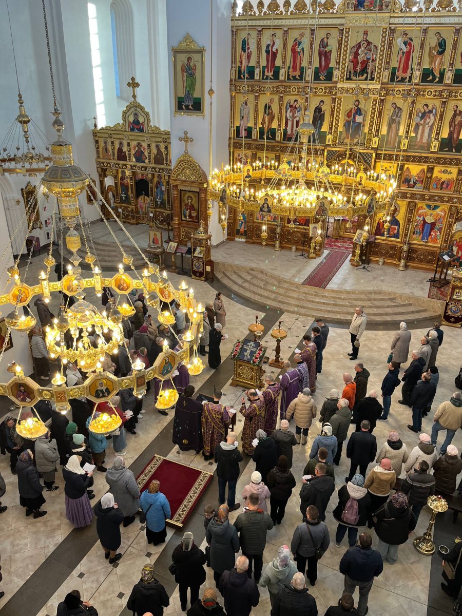 В cубботу вечером на всенощном бдении в центр храма торжественно выносится Животворящий Крест Господень - напоминание о приближающейся Страстной Седмице и Пасхе Христовой. После этого священники и прихожане храма совершают перед крестом три поклона.
