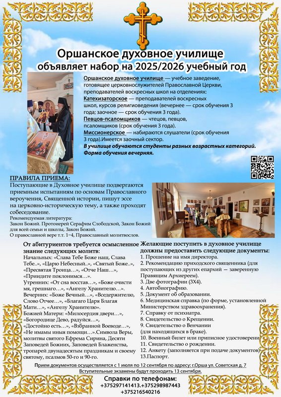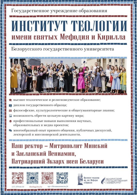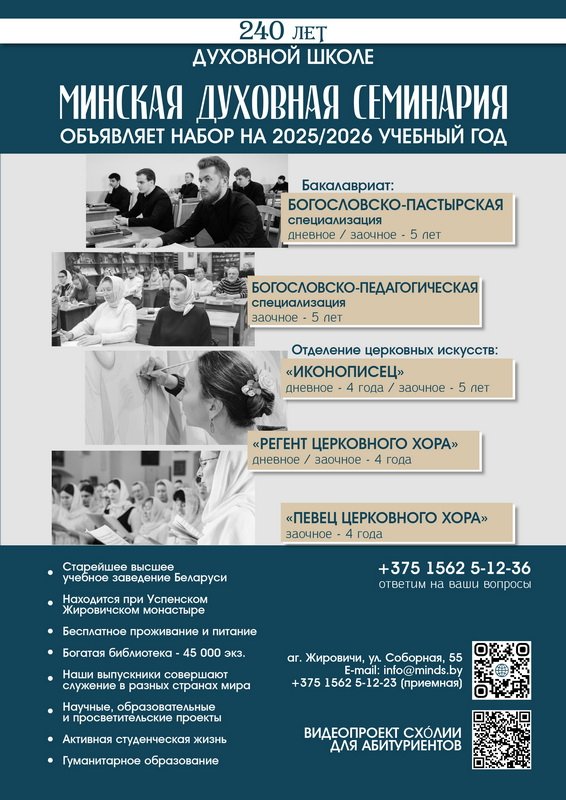| | 13 ИЮНЯ 2025 (Пятница) 11:59:02 Объявлены правила приема в 2025 году в духовные учебные заведения Белорусской Православной Церкви – Минскую духовную академию, Минскую духовную семинарию, Витебскую духовную семинарию, Институт теологии БГУ, Минское духовное училище, Витебское женское духовное училище, Оршанское духовное училище.