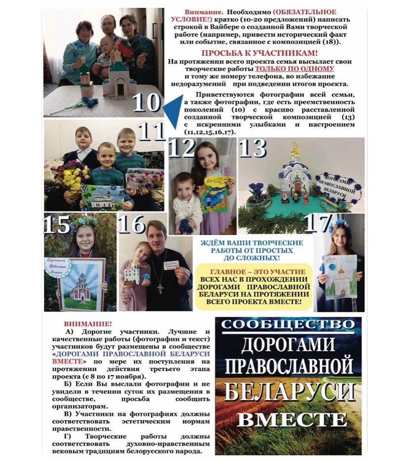 | 11 НОЯБРЯ 2025 (Вторник) 09:27:02 С 8 по 17 ноября проходит третий этап семейного творческого проекта "Дорогами православной Беларуси".Проект стартовал 19 октября и продлится до 20 января. Предусмотрены шесть этапов. Участие в проекте можно начать с любого этапа! Итогом каждого станет видеопрезентация лучших работ, которые можно будет посмотреть на YouTube канале "Сердцеград". Организаторы: Синодальный миссионерский отдел Белорусской Православной Церкви и Благотворительный фонд поддержки семьи, материнства и детства "Покров". Для кого проект: для всех, кто интересуется православной духовностью, белорусской историей и культурой. Участники смогут больше узнать об истории, архитектурных памятниках, материальных и духовных богатствах монастырей, святых и святынях Беларуси. Как принять участие: вступить в сообщество в Вайбере, оправив запрос с на номер: +375 29 3851609. В сообществе будет подробная информация о проекте. Участники 3-го этапа создают творческий композиционный сюжет на православную тематику, взятый только по Гомельской области. Необходимо: — внимательно прочитать условия — выполнить творческое задание — выслать фотографии в сообщество Итогом третьего этапа станет презентация лучших работ! Если вы не участвовали в первом этапе — это не является препятствием! Присоединиться можно на любом этапе! Присоединяйтесь к творческому проекту, а также приглашайте принять в нем участие своих друзей и близких! 100 активных семей получат подарки по почте. Из них 40 самых активных семей будут приглашены на Рождественский концерт. Подробнее об участии можно узнать в Положении о конкурсе по ссылке для скачивания. Условия участия в третьем этапе представлены по ссылке для скачивания. / sobor.by/ (просмотров 603) |