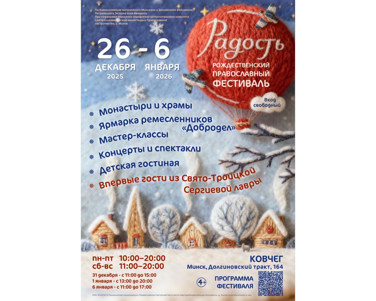| 2 ДЕКАБРЯ 2025 (Вторник) 16:59:13 "Радость" - большой православный фестиваль для всей семьи - пройдет в духовно-просветительском центре "Ковчег" Свято-Елисаветинского монастыря 26 декабря - 6 января.В программе: - Натуральная продукция монастырей и храмов из Беларуси, России, Сербии, Палестины, Сирии и Греции, созданная с любовью! - Благотворительная выставка-ярмарка ремесленников «Добродел» - Гости из Свято-Троицкой Сергиевой лавры - Рождественские диалоги - Рождественские концерты - Голубой огонек - Мастер-классы - Кукольный театр «Батлейка» - Интерактивная экспозиция «Снежная королева» - Детский конкурс объемных макетов «Зимние сказки». Фестиваль «Радость» - это место, где каждый найдет что-то по душе: возможность подготовиться к празднику, купив душевные подарки, принять участие в творческих мастер-классах, окунуться в мир сказки и совершить доброе дело, поддержав благотворительные инициативы. Фестиваль будет работать ежедневно: 11.00-20.00. Сб., вс. – 10.00-20.00 31 декабря – 11.00-15.00 1 января – 13.00-20.00 6 января – 11.00-17.00 Вход свободный! Адрес: Минск, Долгиновский тракт, 164. / sobor.by/ obitelfest.by (просмотров 379) |