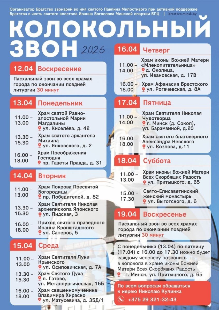 С понедельника (13.04) по пятницу (17.04) ежедневно с 16.00 до 17.30 на территории прихода иконы Божией Матери "Всех скорбящих Радость" (Минск, ул. Притыцкого, 65) будет организована открытая площадка. Любой желающий сможет подняться на колокольню и под руководством опытных звонарей совершить пасхальный звон.