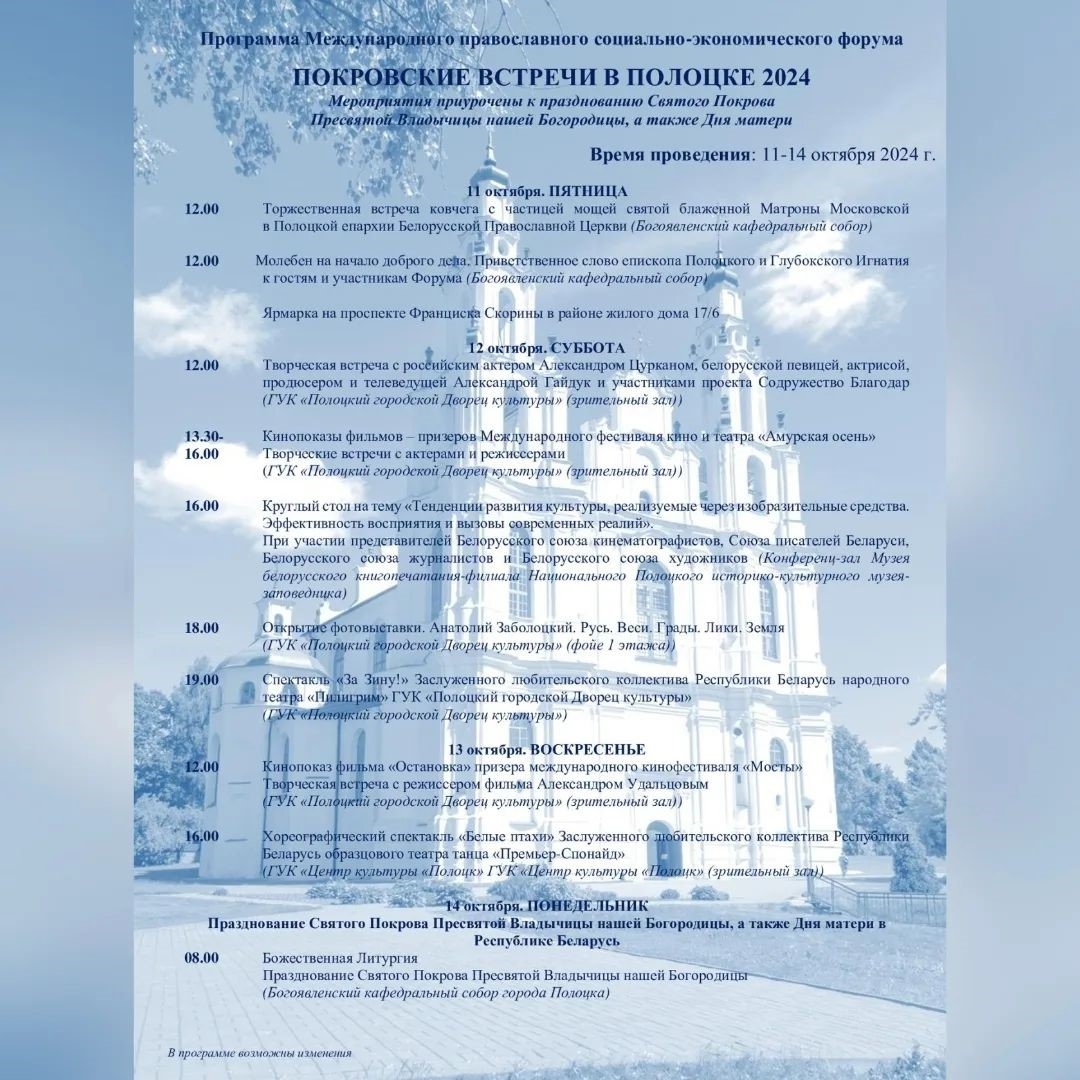 С 11 по 15 октября будет проходить Международный православный социально-экономический форум "Покровские встречи в Полоцке". Мероприятия приурочены к празднованию Покрова Пресвятой Владычицы нашей Богородицы, а также Дня матери.
