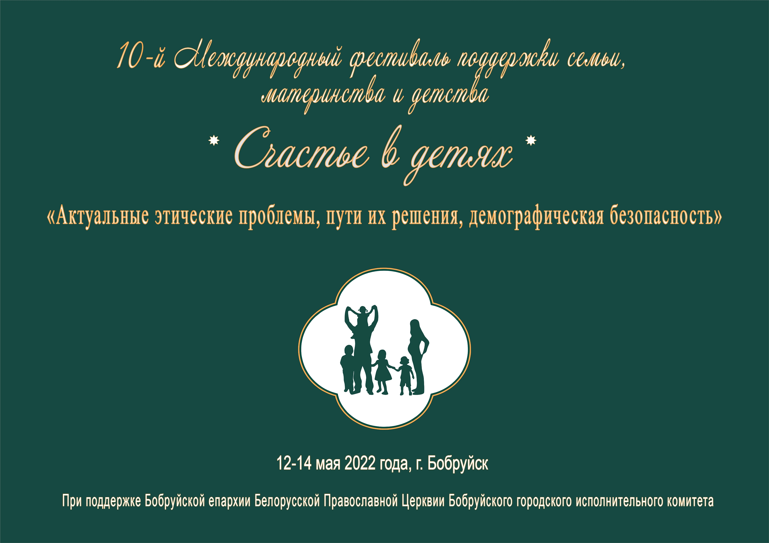 С 12 по 14 мая в Бобруйске пройдёт X Международный фестиваль поддержки семьи, материнства и детства "Счастье в Детях". Тема форума: "Актуальные этические проблемы семьи: пути их решения, демографическая безопасность".