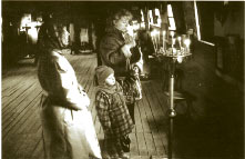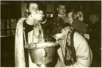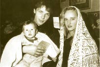Erwachsenentaufe ist nichts Ungewohnliches (unten). Sie wird auf unserem Bild von Vater Serge, dem zweiten Priester der Gemeinde, vorgenommen. Er hat zehn Jahre Choreographie studiert, ist geweihter Priester, hat aber noch nicht Theologie studieren können.