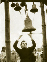 Ein junger Seminarist leistet Küsterdienste. Auf dem nebenstehenden Bild ruft er die Gemeinde zum Gottesdienst in der Zeltkirche.