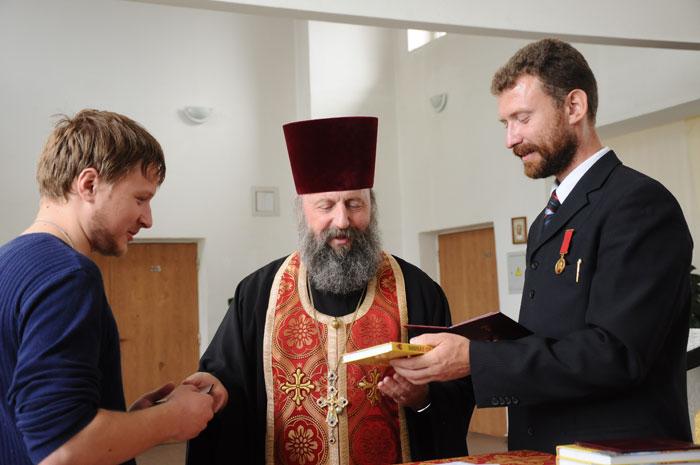 Отец Игорь и директор школы звонарей Богдан Березкин вручили свидетельства об окончании Школы звонарей с присвоением квалификации «церковный звонарь» 8 выпускникам.