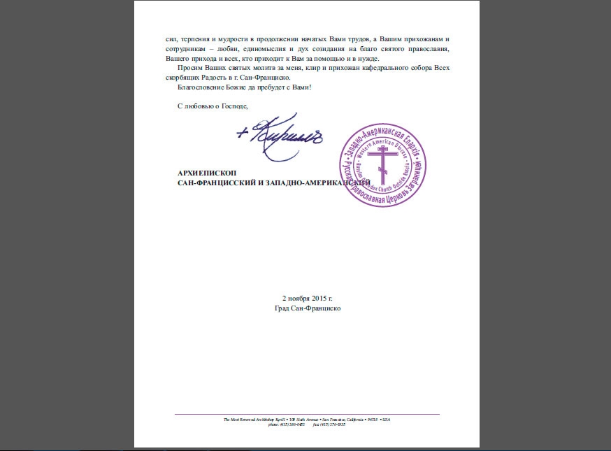 Благодаря нашему общению и сотрудничеству, русское церковное единство продолжает укрепляться и приносить свои добрые плоды. Желаю Вам, дорогой батюшка, сил, терпения и мудрости в продолжении начатых Вами трудов, а Вашим прихожанам и сотрудникам любви, единомыслия и дух созидания на благо святого православия, Вашего прихода и всех, кто приходит к Вам за помощью и в нужде.