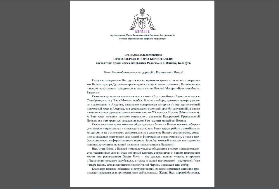 Священнослужителям нашего собора довелось бывать в Вашем приходе, общаться с клиром и прихожанами и засвидетельствовать Ваши труды: работу с онкобольными детьми и их родителями, самоотверженное служение Вашего сестричества, создание социальных мастерских для людей с физическими ограничениями, а также профессионального информационного портала Sobor.by, который стал для нас одним из главных источников новостей из жизни православных в Беларуси.