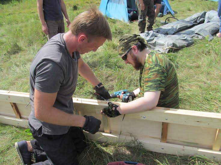 Около семи часов вечера участники сплава обосновались в очень живописном месте на крутом песчаном берегу, где все сразу нашли себе занятия по интересам. Ребята натянули верёвку для игры в волейбол, кто-то пошёл собирать лесные ягоды, многие купались или делали зарисовки местности.