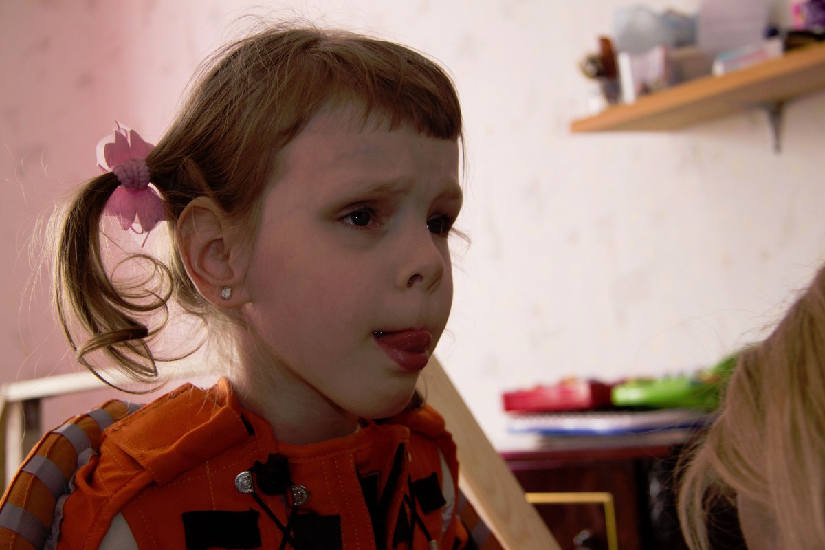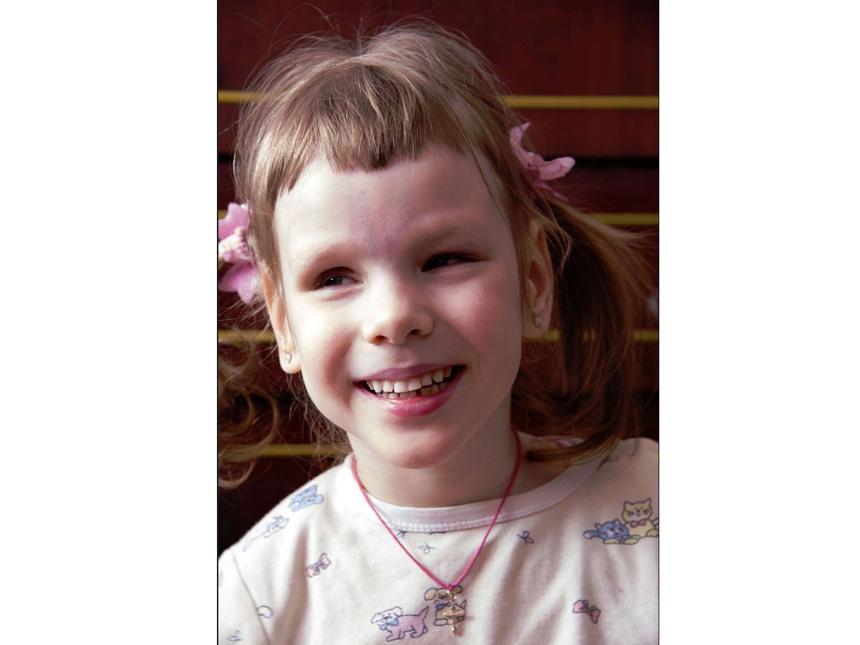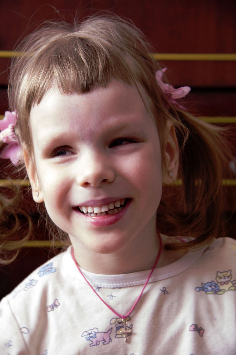 Глядя на эту девочку, я всё не могла поверить, что она не видит. Настя жизнерадостная, с живой мимикой, с её личика не сходит улыбка. Но у девочки нет и остаточного зрения. И ещё она самостоятельно не передвигается, у неё спастический тетрапарез 2- 3 степени. Сейчас перед родителями стоит задача научить её ходить, чтобы Настюша могла овладеть элементарными навыками самообслуживания: передвигаться на небольшие расстояния, выполнять гигиенические процедуры.