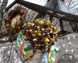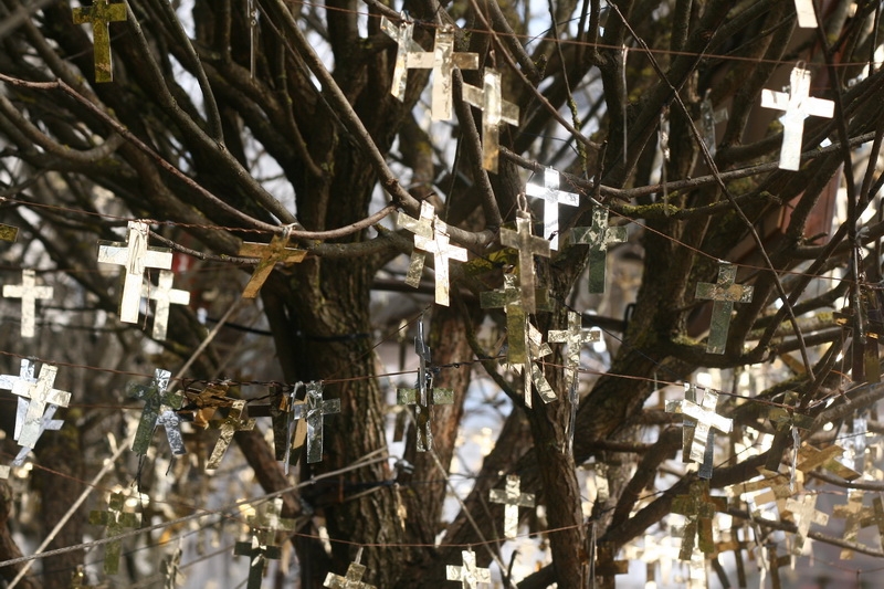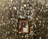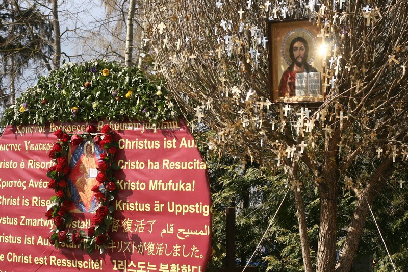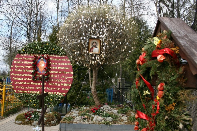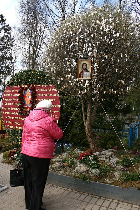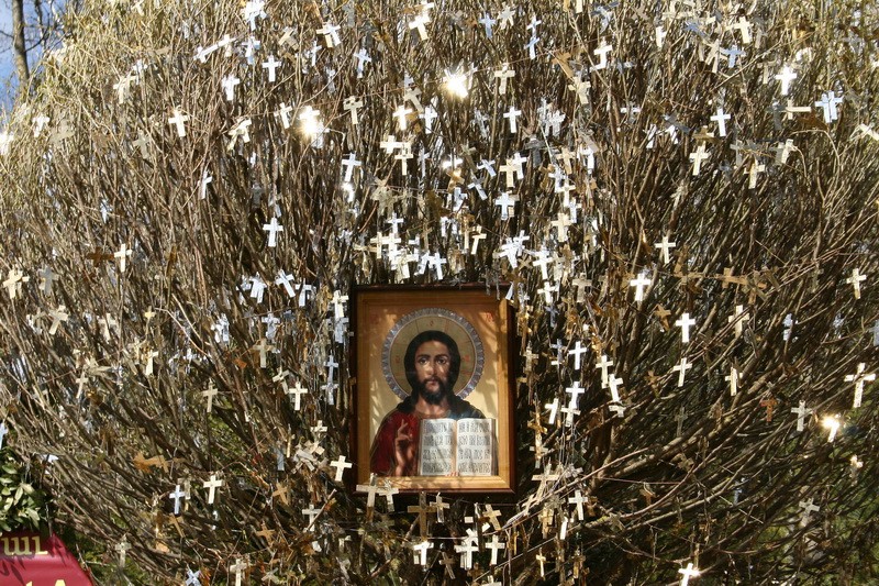 Так к Пасхе рядом с сенью появилось настоящее живое дерево с иконой Спасителя, украшенное сотней золотых крестиков.