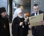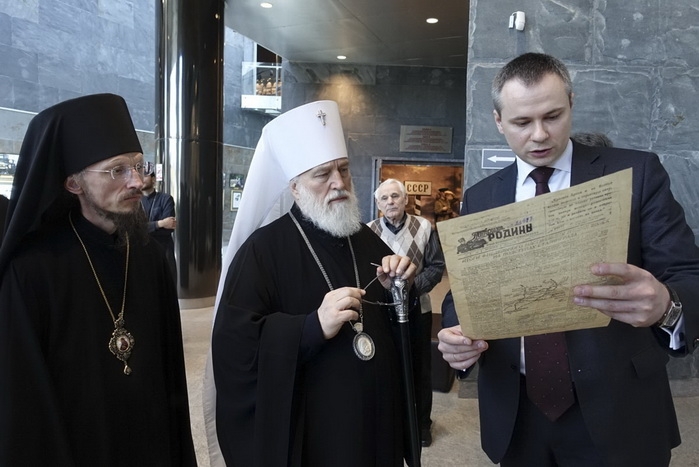 Из фондов музея митрополиту Павлу представили подпольные белорусские газеты "Патриот Родины" и "За Родину", листовки "Божией милостью", а также газетные сообщения военных лет о пожертвованиях православных приходов для освобождения Отечества.