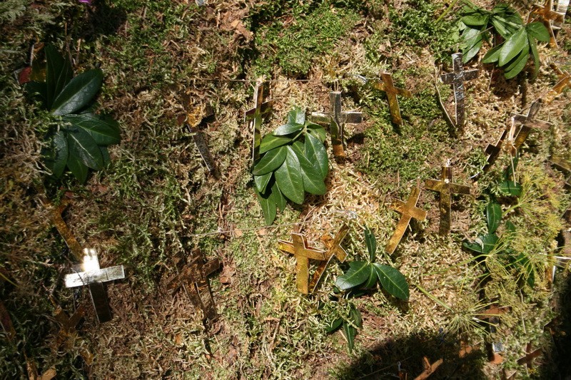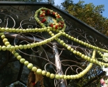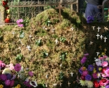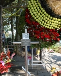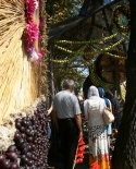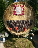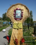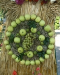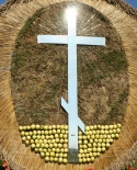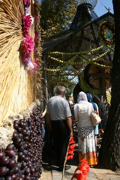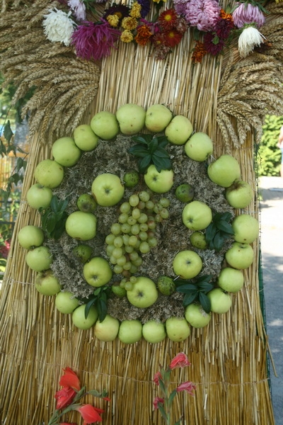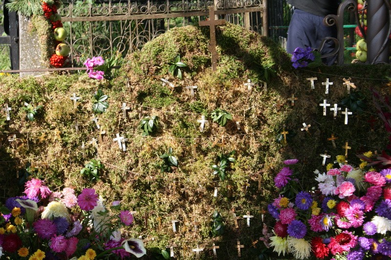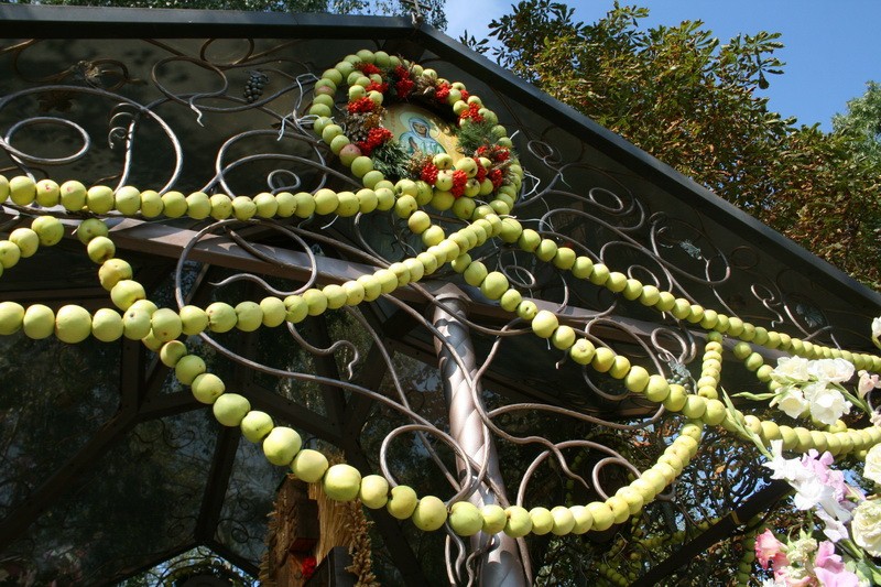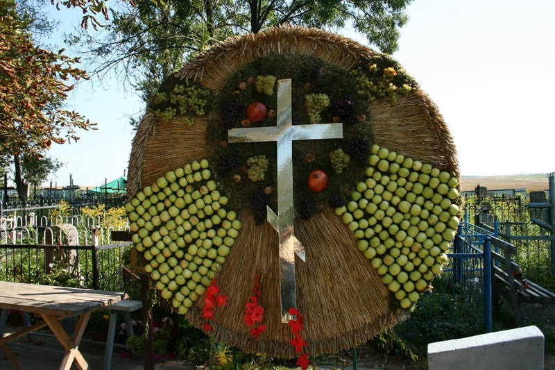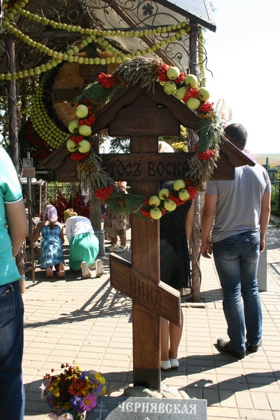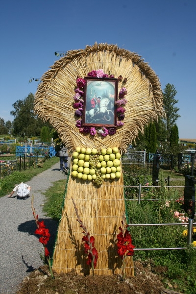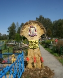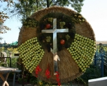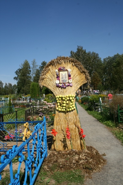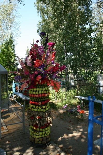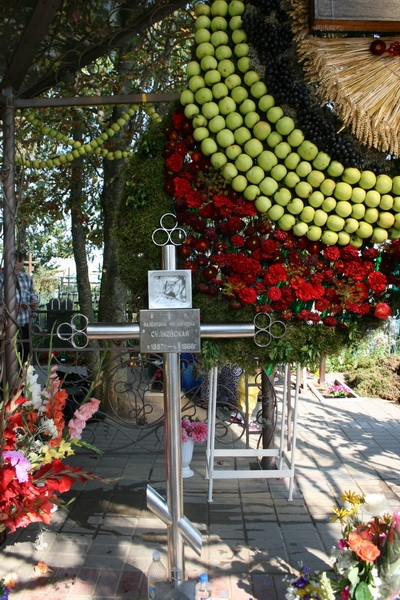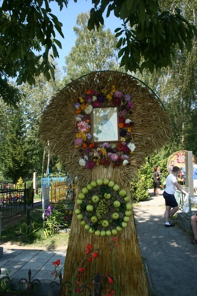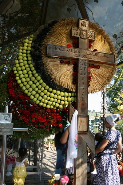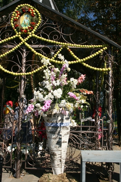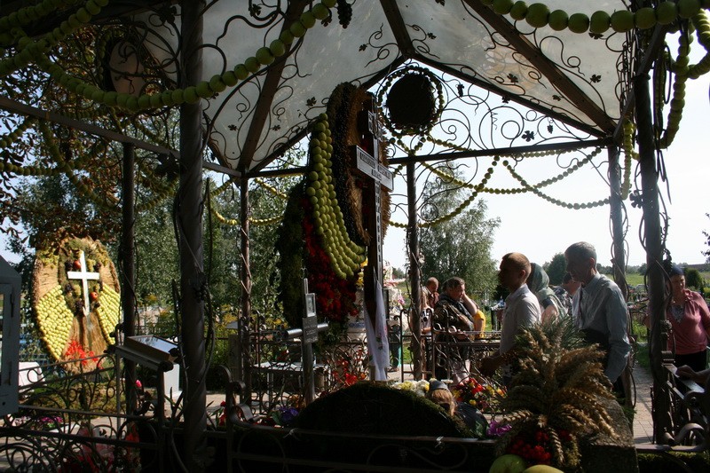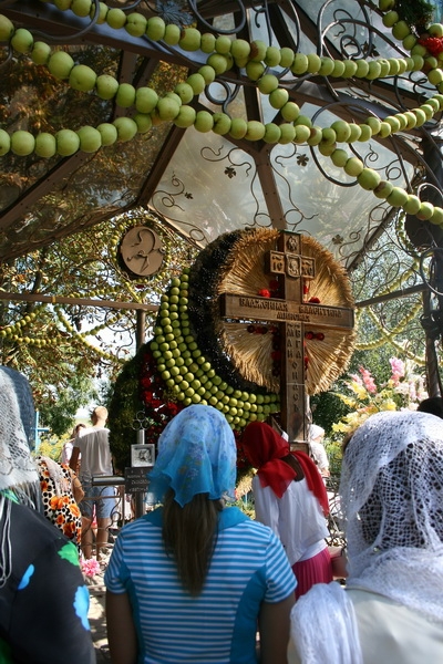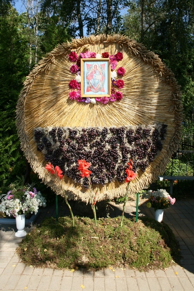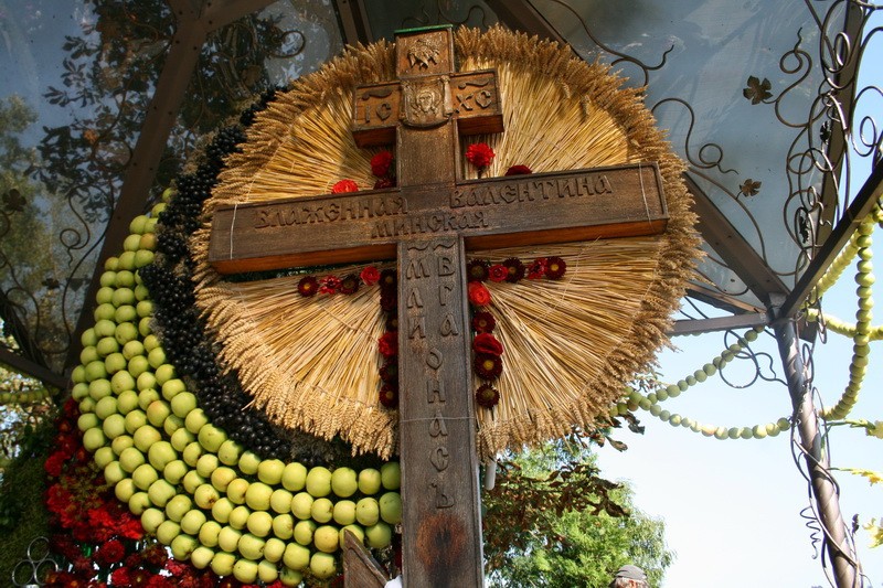Матушкину сень паломники украсили гирляндами из яблок. Крест у могилки блаженной Валентины Минской поразил удивительной конструкцией из колосков, винограда, яблок, георгин и мха.