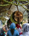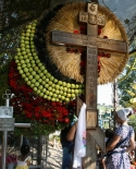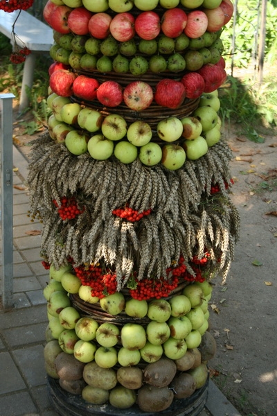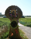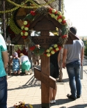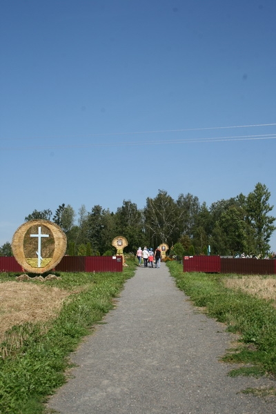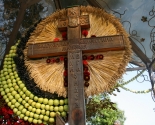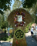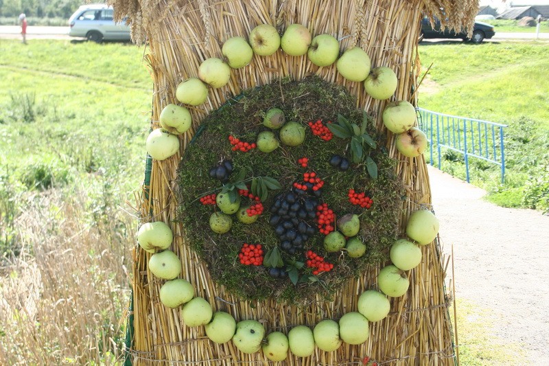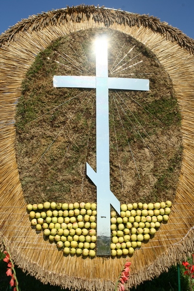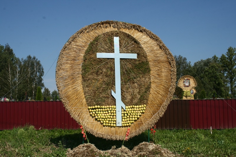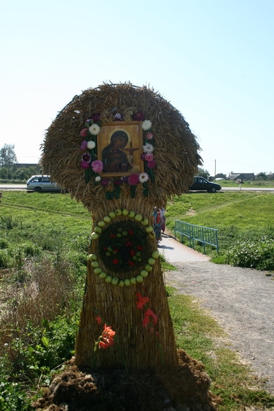 Ещё с проезжей части можно было увидеть сияющий на солнце крест, с любовью украшенный природными материалами из белорусских лесов, полей и садов: колосками, мхом и, конечно, яблоками, которые являлись главным элементом украшений праздника.