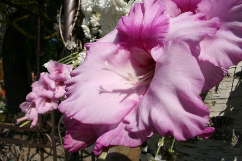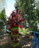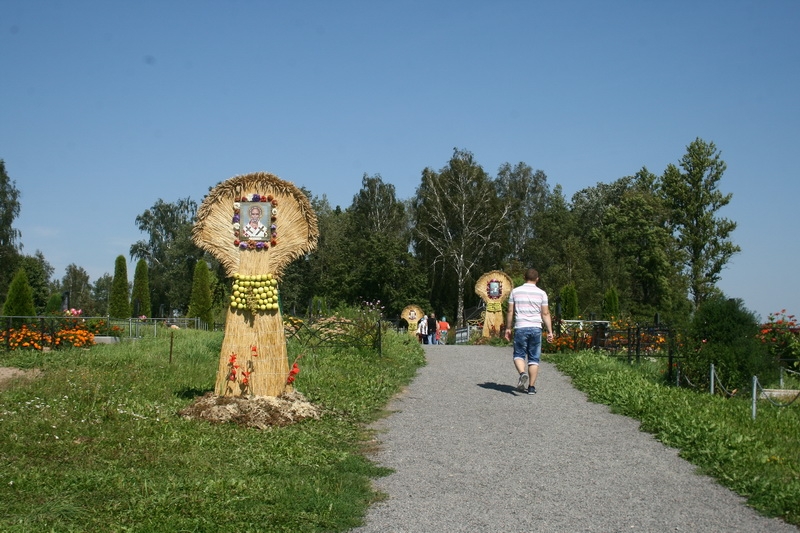Вдоль аллеи, ведущей к могилке матушки Валентины, трудники создали живописные конструкции из колосков, в центре которых в рамке из живых цветов расположились иконы.