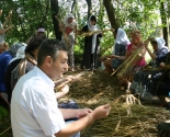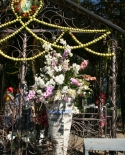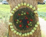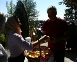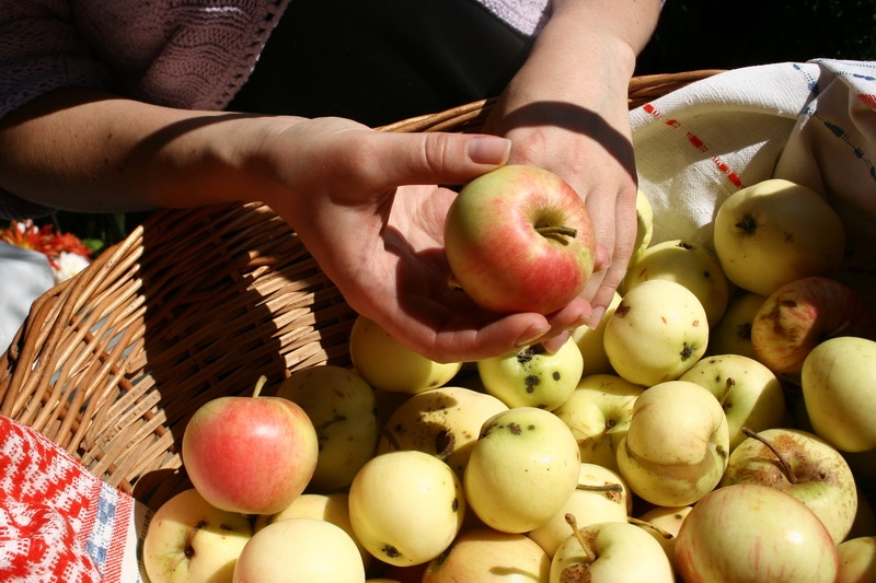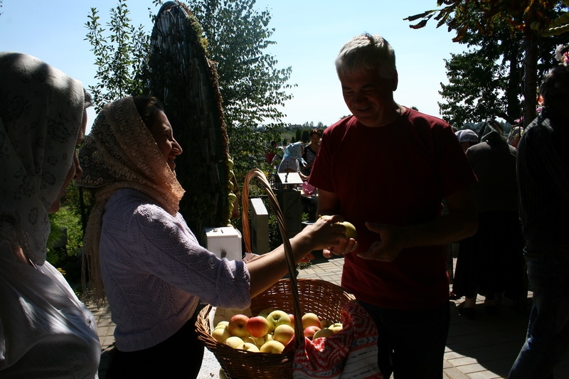 Украшения к празднику дополнили высокие вазы, созданные из живых материалов. Одна из них состояла из бересты, вторая – совершенно другая: каркас вазы обвивали яблоки, колоски и рябина. Каждая ваза была наполнена яркими цветами, которые для украшения святого места пожертвовали люди из ближайших деревень. После приложения к кресту, люди могли получить в подарок от матушки Валентины освящённое яблоко.