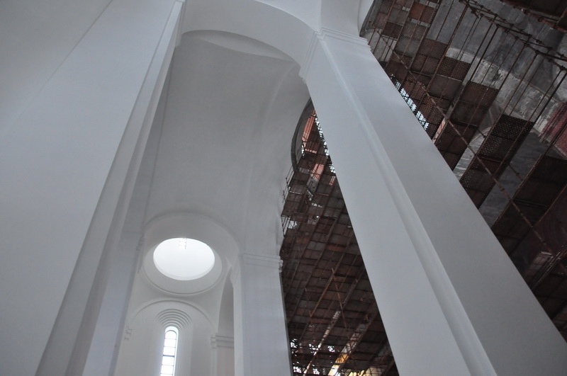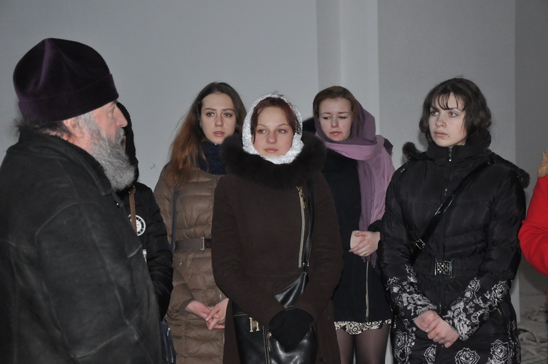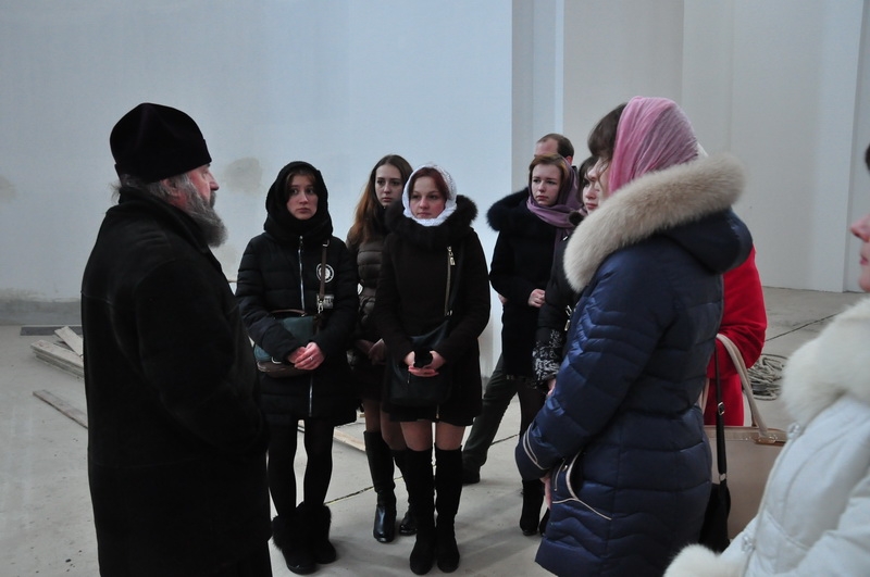 Экскурсию для группы будущих специалистов библиотечной сферы провёл настоятель прихода протоиерей Игорь Коростелёв. Первым делом молодые люди прошли в строящийся собор в честь иконы Божией Матери "Всех скорбящих Радость". Переступив порог храма студенты были приятно удивлены масштабом сооружения, его величием,