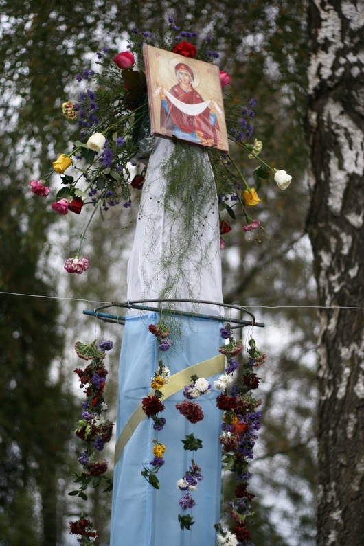 Все материалы, которые используются для убранства, местные: цветы жертвуют дачники, барвинок, еловые веточки и мох - из леса.