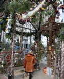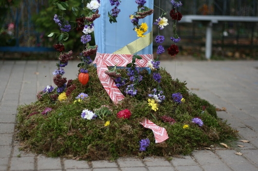 Каждое украшение несёт в себе определённый символ. Праздник оформлен в голубом цвете - это цвет Богородицы. Ваза у входа в сень голубой лентой взметнулась вверх, а на её шпиле – икона Божьей Матери, на которой она распростёрла свой омофор над всем миром.