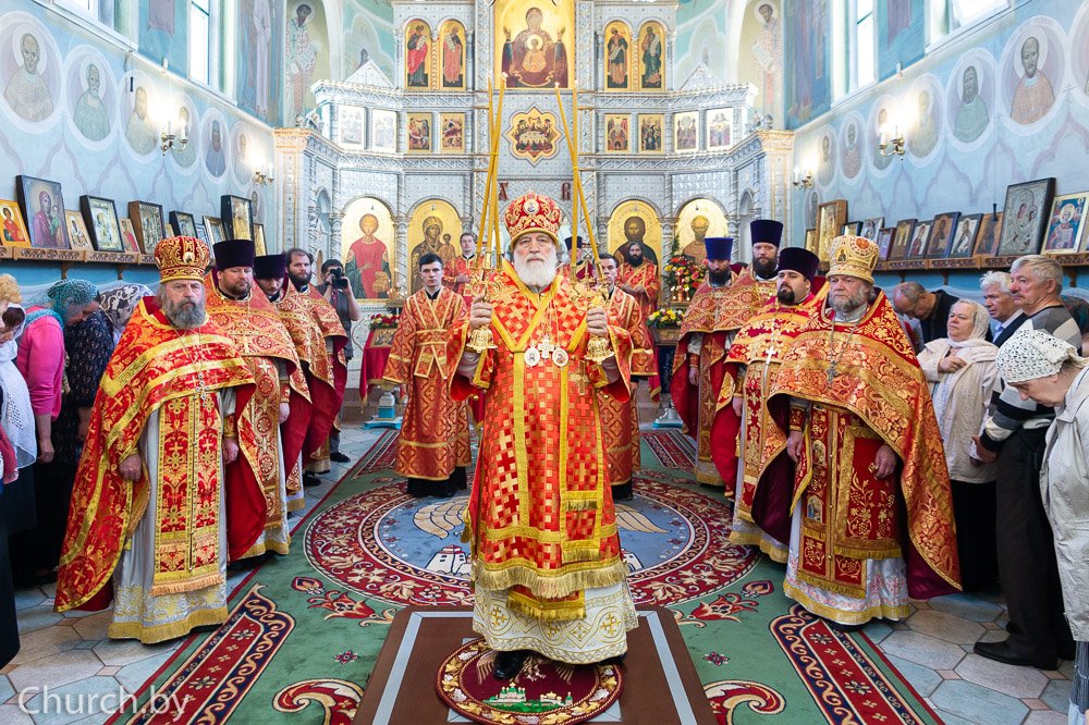 Его Высокопреосвященству сослужили: настоятель Всехсвятского прихода протоиерей Феодор Повный, благочинный 2-го Минского городского округа, настоятель прихода храма иконы Божией Матери "Всех скорбящих Радость" города Минска протоиерей Игорь Коростелёв, секретарь Минской епархии протоиерей Андрей Волков и клирики прихода.