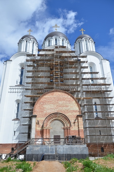 К концу апреля монтажники выполнили свои обязательства по установке наружных лесов и в начале мая с достижением положительных температур штукатуры смогли приступить к завершению фасадных работ на западной стороне здания собора. На данный момент уже выполнены основные элементы пилястр и колонн на больших окнах собора. Отремонтированы и восстановлены повреждённые элементы кладки. Большая роль в этой сложной работе была отведена механизации вертикально-транспортных перемещений грузов. В зимний период активистами прихода были произведены ремонтно-восстановительные работы любезно предоставленной Валерием Александровичем Поткиным транспортной лебедки. Если раньше грузы поднимались вручную с помощью блока, верёвки и мышечной силы, то большую помощь сейчас оказывает электрический механизм, который позволяет увеличить скорость работ. Уже скоро штукатуры завершат первый этап своих работ и им в помощь придут высококвалифицированные кровельщики, которые работают с медным листом. Они выполнят накрывки сложных элементов на фасаде и защитят конструкции от атмосферных осадков.