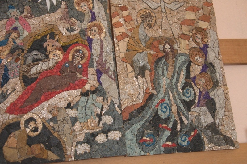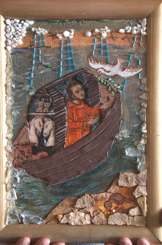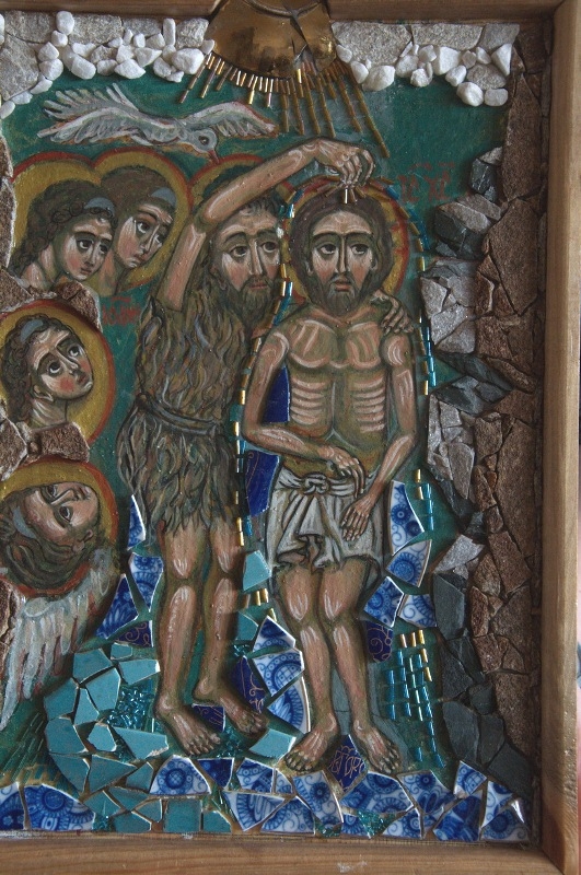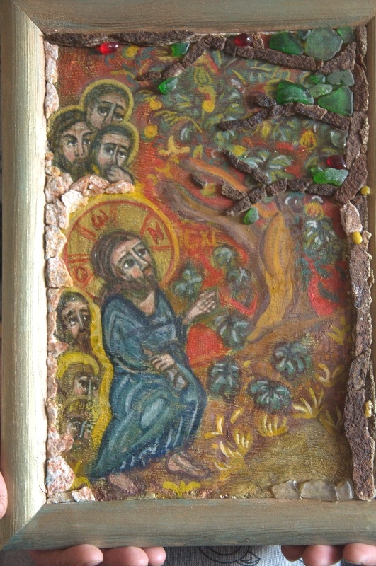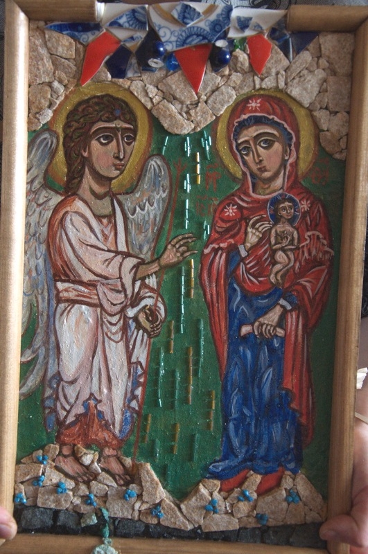 - Отчасти я переношу сюда технику иконописную. Дроблю камешки и получаю пигмент. Он смешивается с желтком, добавляется чуть-чуть вина с водой. Потом я пишу на доске по левкасу. А потом приступает к работе мама. Она берёт эти же камни, только уже раскалывает их, а потом пинцетом выкладывает мозаику - получается оклад.