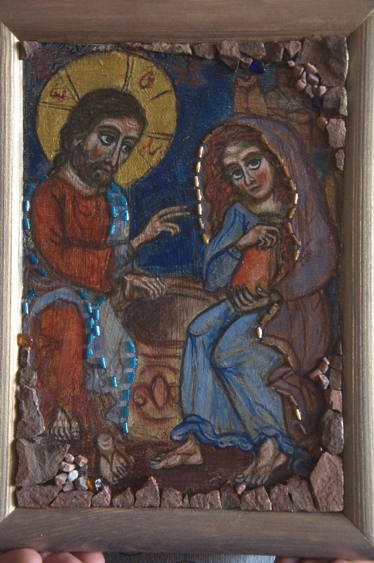 - Это моя любимая работа. Это первое чудо Божье, чудо радости. Свадьба - самый счастливый день для людей, для их семей. И когда Господь посетил этот праздник, это была величайшая радость. Но не мы, ни, думаю, те люди, которых посетил в этот день Господь, не могли в полной мере осознать масштаб происходящего у них за столом, в их небогатом жилище: Сам Господь посетил их. А тут Он ещё и совершает Своё первое чудо: претворяет воду в вино… И мне эти бочки показались настолько благословенными… Я увидела их в этом жёлто-белом цвете. И мне было особенно трепетно и радостно. Я вспомнила, как сама была невестой. И пока я делала эту работу, я всё это переживала заново. И это было чудесно.