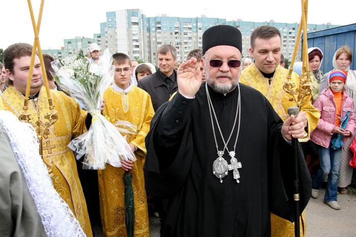 По прибытии Крестного хода к цели путешествия в притворе строящегося храма был совершен молебен. После молебна с архипастырским приветственным словом к собравшимся обратился управляющий Гродненской епархией, епископ Гродненский и Волковысский Артемий.