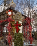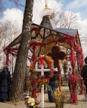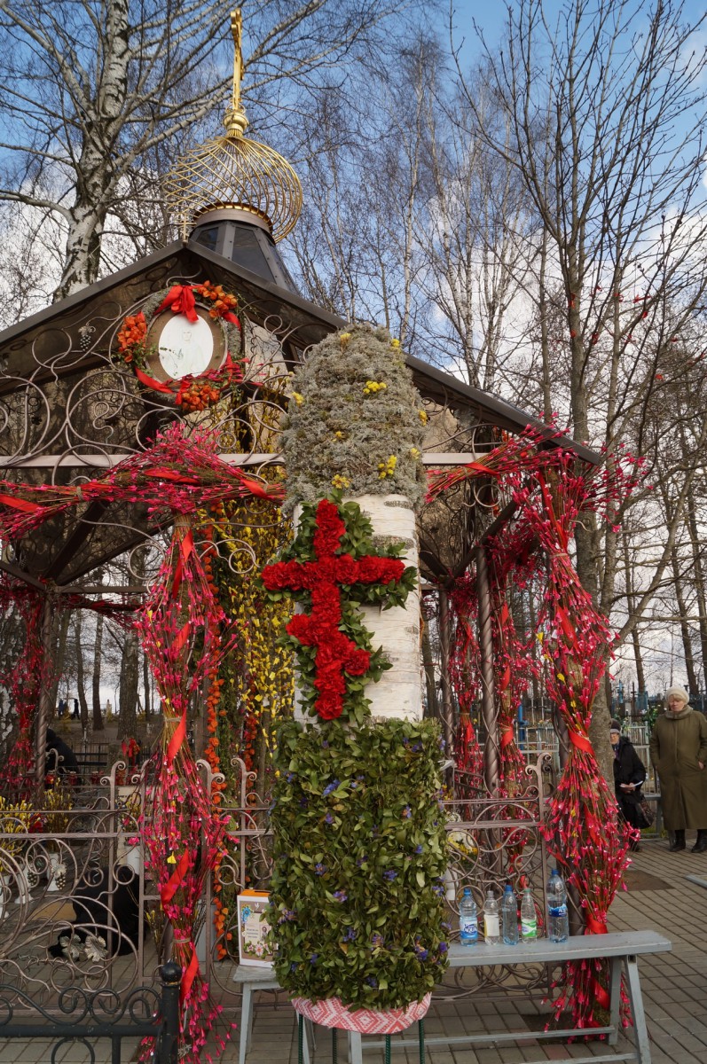 Ко всем большим церковным праздникам матушкину сень паломники неповторимо украшают природными материалами: к нынешним праздникам - веточками вербы, вазами из лозы, берестой, цветами и травами. Увидев эту красоту, созданную во славу Божию с любовью и молитвой - радуется глаз, ликует сердце.