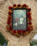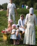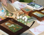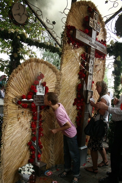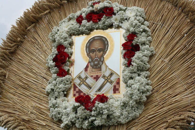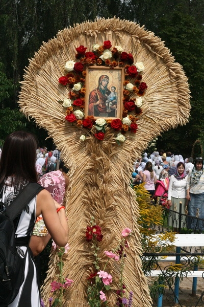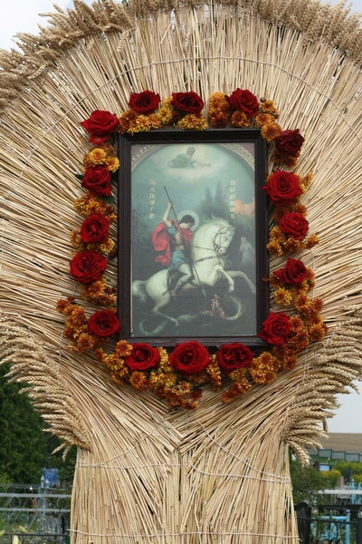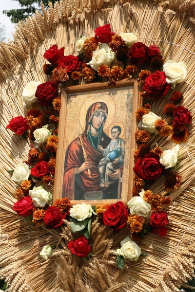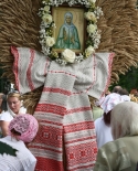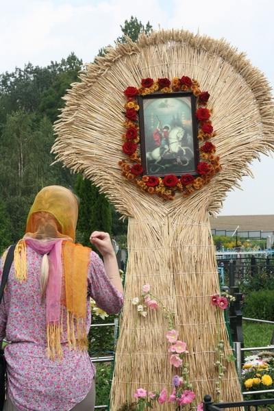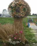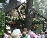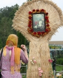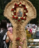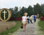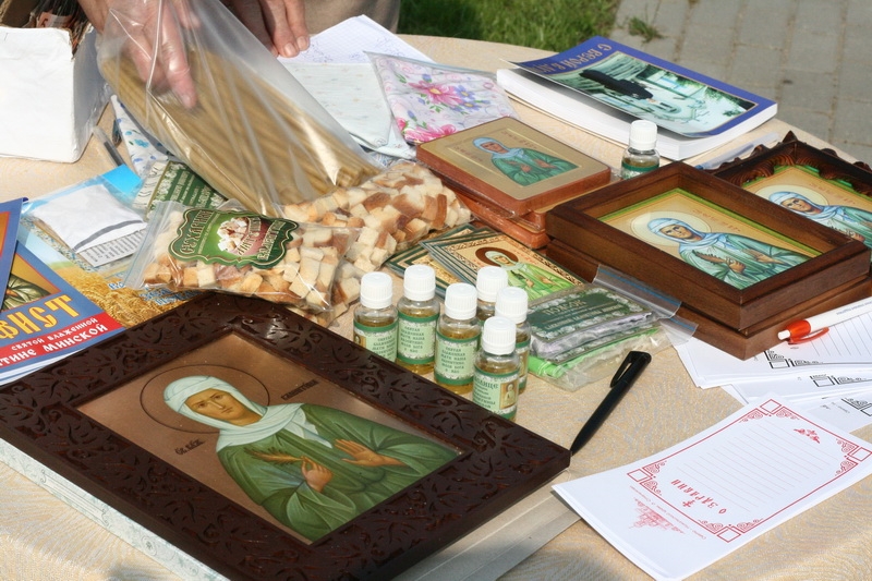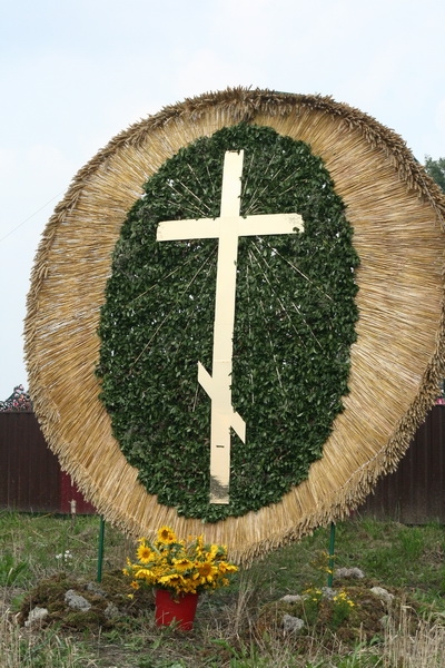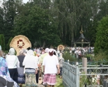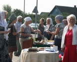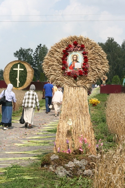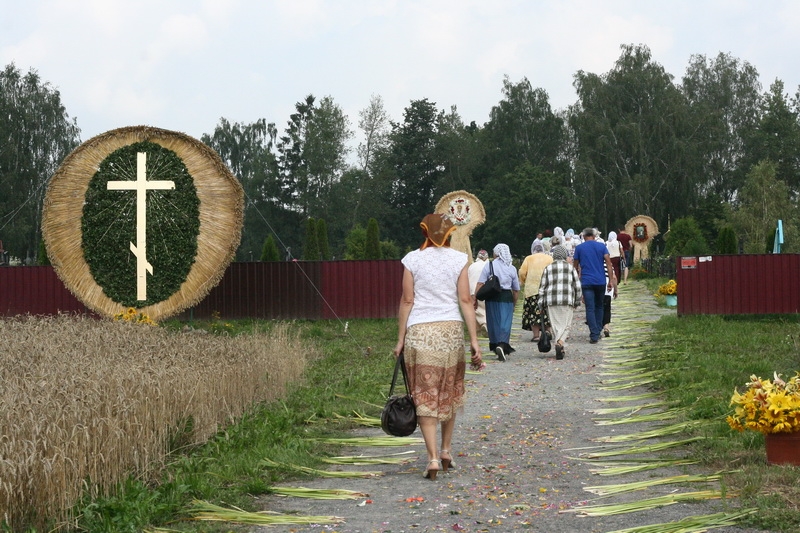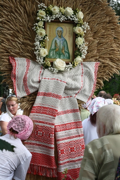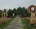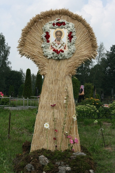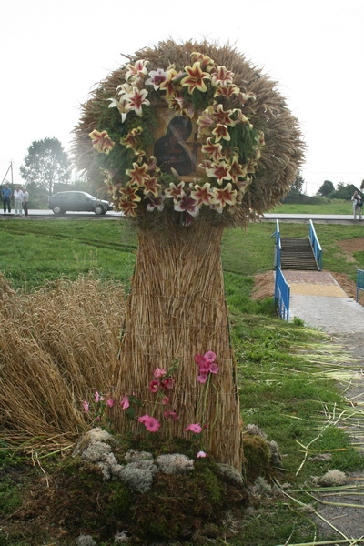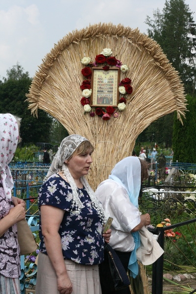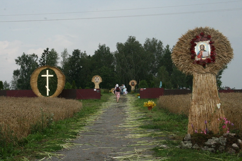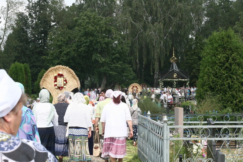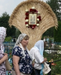 По окончании службы прихожанам раздали иконки блаженной Валентины Минской, после чего большинство верующих отправились в соседнюю деревню Крысово, на сельском кладбище которой упокоена матушка Валентина. Уже с трассы всех приезжающих святое место встречало удивительными инсталляциями из колосьев пшеницы, увенчанных иконами Господа и Пресвятой Богородицы. По дороге к месту упокоения святой старицы взору постепенно открывались и другие инсталляции с образами Николая Чудотворца, Георгия Победоносца, Собора Всех Белорусских Святых, Минской иконы Божьей Матери и иконой святой блаженной Валентины Минской. Матушкина сень по доброй традиции была с любовью и молитвой украшена паломниками дарами родной белорусской природы - местными цветами и растениями, колосьями пшеницы.