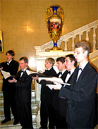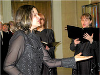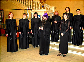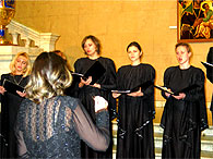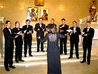 Bо время Богослужения человек может получить духовное очищение, нравственно просветиться, приобщиться к возвышенному. Помогает этому приобщению богослужебное пение, которое является одной из форм Богослужения, формируется словом и им же управляется. Церковная музыка Православной Церкви есть музыка вокальная, то есть музыка, производимая одними человеческими голосами в соединении со словами. Некоторые отцы Церкви обосновывают запрет на инструментальную музыку тем, что музыкальные инструменты широко употребляются в языческих культах. Если слово в полной мере способно выразить конкретные идеи, то инструментальная музыка выражает только эмоциональный элемент, субъективный. Ведь недаром к одной и той же мелодии можно применить разные тексты. В Богослужении только слова недвусмысленно передают то, что содержат в себе молитвы, поучения, проповеди. Но только человеческим голосом можно воплотить идеи в музыкальных звуках, создать осмысленную мелодию, то есть голос и есть самый совершенный музыкальный инструмент. Виды исполнения, музыкальная форма, музыкальная система церковных песнопений могут быть различны в разных национальных поместных Церквах. Это зависит от исторических условий, местных обычаев, певческих многолетних привычек, от различных местных влияний, от музыкального чувства того народа, среди которого развилось богослужение данной части Православной Церкви. Музыкальный элемент меняется, следуя артикуляционным особенностям данного языка, его естественному ритму, местному произношению и способу пения. Cреди важнейших положений теории и эстетики византийского и древнерусского музыкального искусства - идея его богоданности, идея богодухновенности. Моменты дарования свыше, откровения запечатлены на древних иконах, многочисленных евангельских миниатюрах, устных преданиях о прославленных песнопевцах Древней Церкви, в текстах самих песнопений, в тайных молитвах священника о сослуже-нии ангельских сил и людей. Христианский храм был "небом на земле для человека, который, входя в храм, погружался в особый мир." Этому способствовала и архитектура со своими условиями особенной акустики, и музыка, и живопись. Все элементы храмового пространства были наполнены мистическим, символическим духом. Здесь не было ничего случайного, все было упорядочено, подчинено Уставу, понятии иерархического порядка. Богослужение шло в строгой последовательности. Все, что кружало человека в храме было подчинено одной идее, и, сливаясь в гармоническое единство, возносило устремления души ввысь. Церковную музыку недаром называют звучащей иконой. Она неразрывно связана с тайной Божественного Домостроительства. Нельзя до конца понять историю Церкви, не изучив историю духовной музыки. Страница илюстрирована фотографиями с выступления хора храма иконы Божией Матери "Всех |
