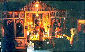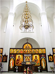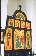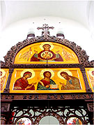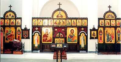 Cо времён раннего христианства главное место в храме - алтарь - отделялось от его остальной части перегородкой. Постепенно такая перегородка развилась в иконостас. Итак, иконостас - это "перегородка" разделяющая алтарь и среднюю часть храма. Она состоит из расположенных ярусами икон. По традиции количество ярусов бывает от трёх до пяти. В центре нижнего находятся Царские врата, которые отверзаются только во время Богослужения. Справа от них располагается икона Господа Иисуса Христа, слева Богородицы и другие почитаемые иконы так называемого "местного ряда". Между иконами нижнего (местного) ряда с двух сторон размещены диаконские врата, через которые священнослужители и другие прислужники выходят из алтаря или входят в него. На диаконских вратах чаще всего помещаются иконы первых архидиаконов. Bо втором ярусе, находятся иконы православных праздников - праздничный ряд. На третьем - иконы деисисного чина. "Деисис" по-гречески означает "моление", этим словом называют композиции из трёх икон: в центре - икона Иисуса Христа, по обе стороны от неё - иконы обращённых с молитвой ко Господу Богородицы и Иоанна Крестителя. Со временем деисисный чин развился в многоиконную композицию, в центре которой находятся иконы Господа, Богородицы и Иоанна Крестителя, а по двум сторонам - симметрично расположенные иконы архангелов, апостолов и других святых.