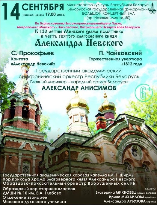 | | 28 АВГУСТА 2018 (Вторник) 11:45:21 14 сентября в 19:00 в Большом зале Белорусской государственной филармонии состоится концерт, посвящённый 120-летию минского Храма-памятника в честь святого благоверного князя Александра Невского.