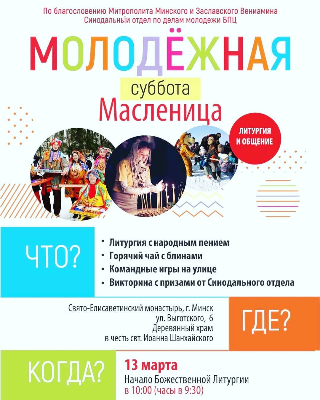 | | 3 МАРТА 2021 (Среда) 10:25:26 13 марта на территории Свято-Елисаветинского монастыря состоится праздник "Молодежная суббота. Масленица". Начало в 10.00.
