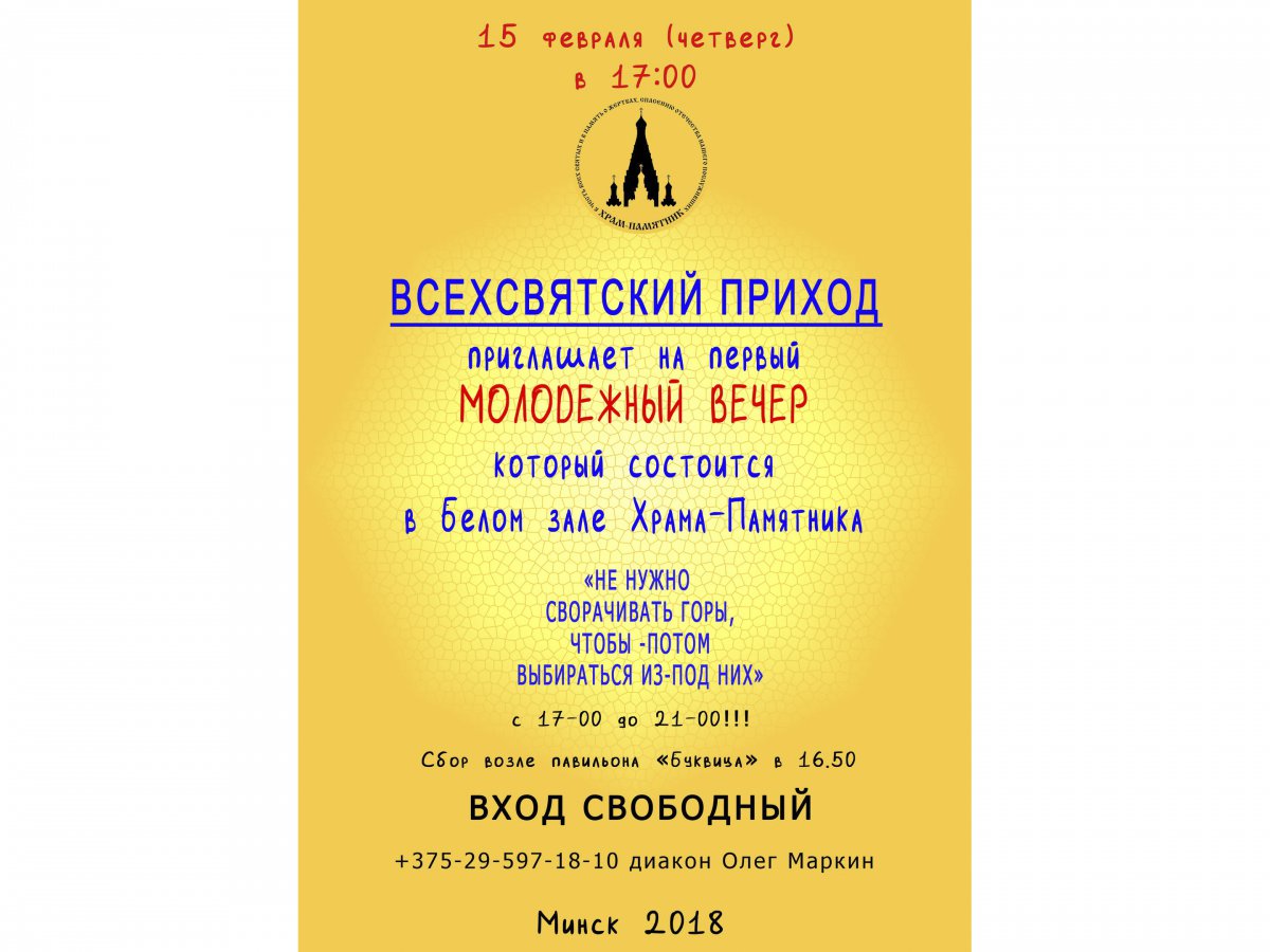 | | 9 ФЕВРАЛЯ 2018 (Пятница) 11:30:07 15 февраля в Белом зале Всехсвятского прихода Минска состоится молодёжный вечер. Встреча в 16:50 у павильона Буквица.