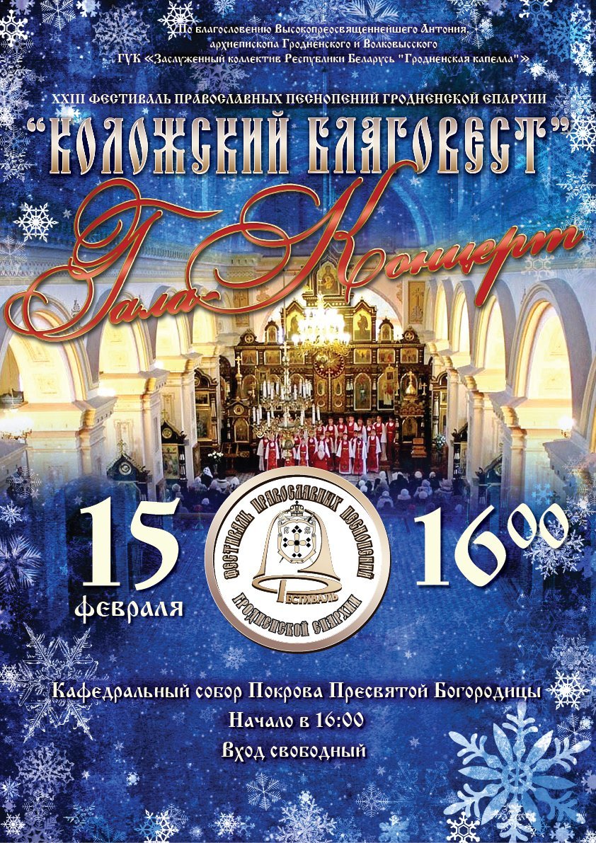 15 февраля в Кафедральном соборе Покрова Пресвятой Богородицы города Гродно состоится гала-концерт XXIII Фестиваля православных песнопений Гродненской епархии «Коложский Благовест».