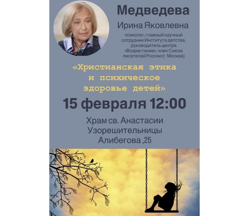 15 февраля в приходе святой Анастасии Узорешительницы состоится встреча с психологом Ириной Яковлевной Медведевой на тему "Христианская этика и психическое здоровье детей".