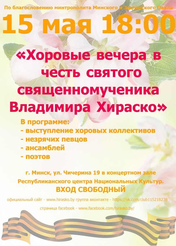 | | 12 МАЯ 2016 (Четверг) 11:44:33 15 мая на сцене Республиканского центра национальных культур (Минск, ул.Чичерина, 19) пройдёт творческая встреча "Хоровые вечера в честь священномученика Владимира Хираско" под символическим названием "Майский вальс". Начало в 18.00.