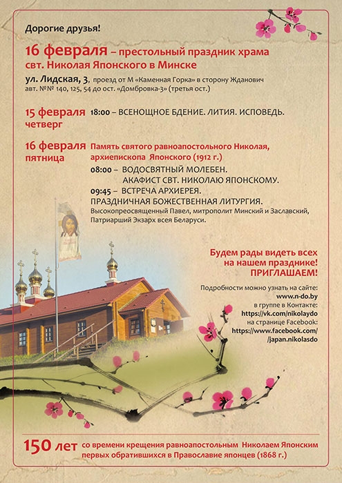 | | 13 ФЕВРАЛЯ 2018 (Вторник) 12:57:26 16 февраля Церковь чтит память святого равноапостольного Николая, архиепископа Японского. В этот день престольный праздник отметит одноименный минский приход. Праздничную Литургию возглавит митрополит Минский и Заславский Павел, Патриарший Экзарх всея Беларуси. Встреча архиерея в 9.45.