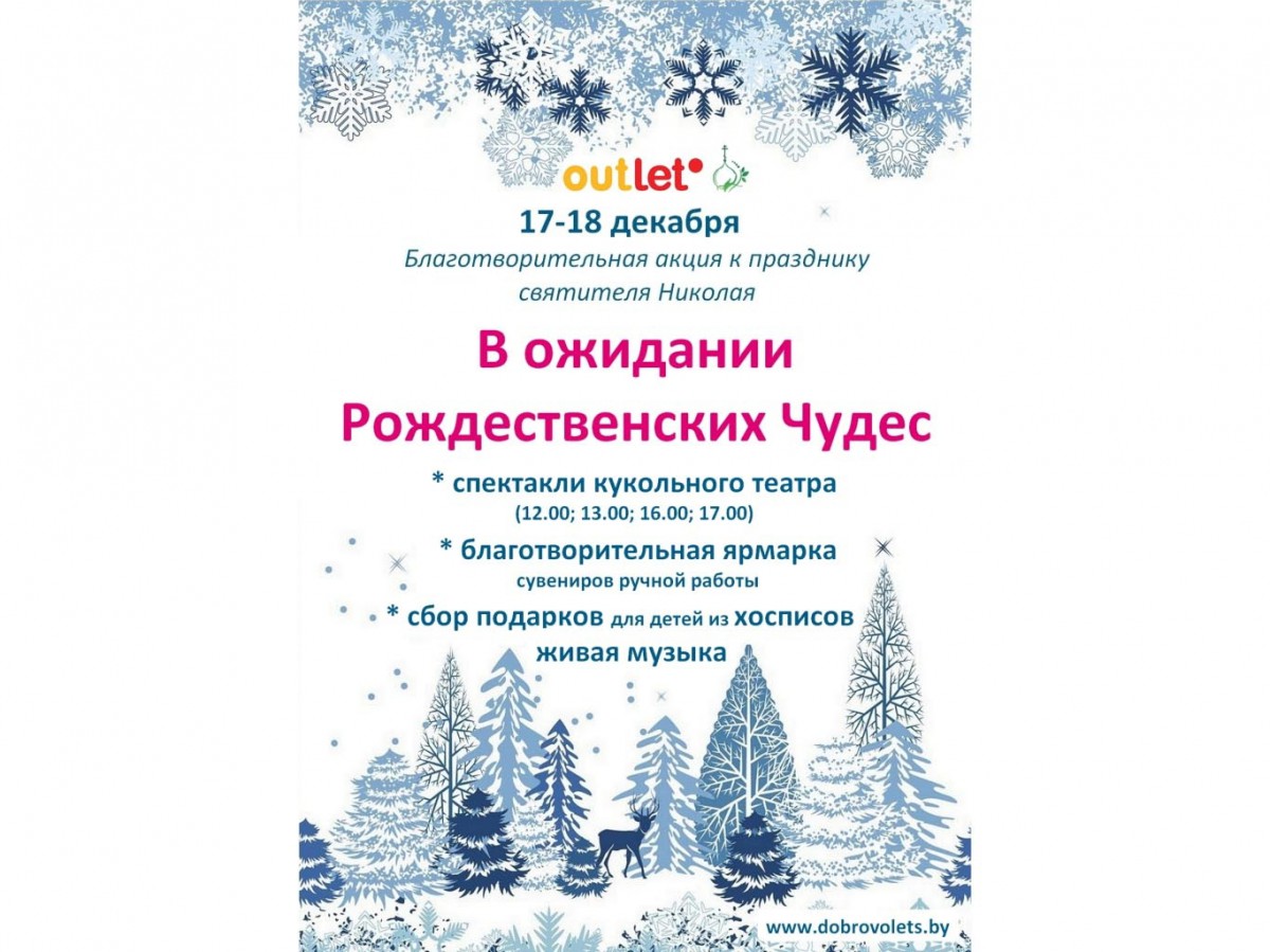| | 15 ДЕКАБРЯ 2016 (Четверг) 12:48:27 17 и 18 декабря с 11.00 до 19.00 в торговом центре "OUTLETO" в Минске будет проходить благотворительная акция "В ожидании Рождественских Чудес". Её цель - сбор подарков для почти 500 детей из хосписов к светлому празднику Рождества Христова!
