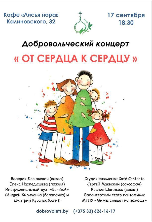 | | 11 СЕНТЯБРЯ 2017 (Понедельник) 13:46:22 17 сентября в минском кафе Лисья Нора (ул.Калиновского, 32) пройдёт благотворительный концерт "От сердца к сердцу". Начало в 18.30.